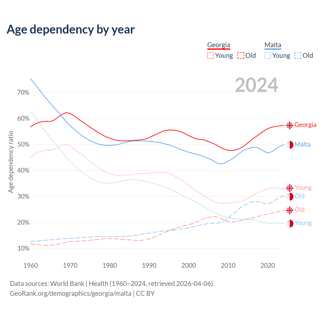 The share of older people aged 65 and over is 15.6% in Georgia and 20.2% in Malta. Life expectancy in Georgia compared to Malta .