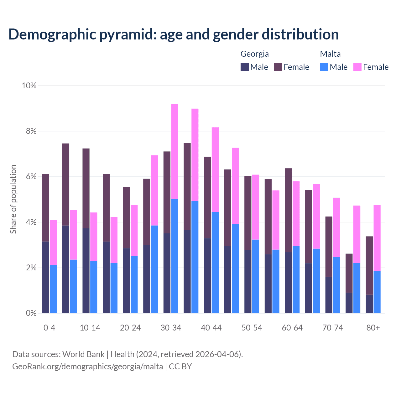 - Georgia is ranked 59/196 by median age (oldest to youngest) vs 36/196 for Malta.