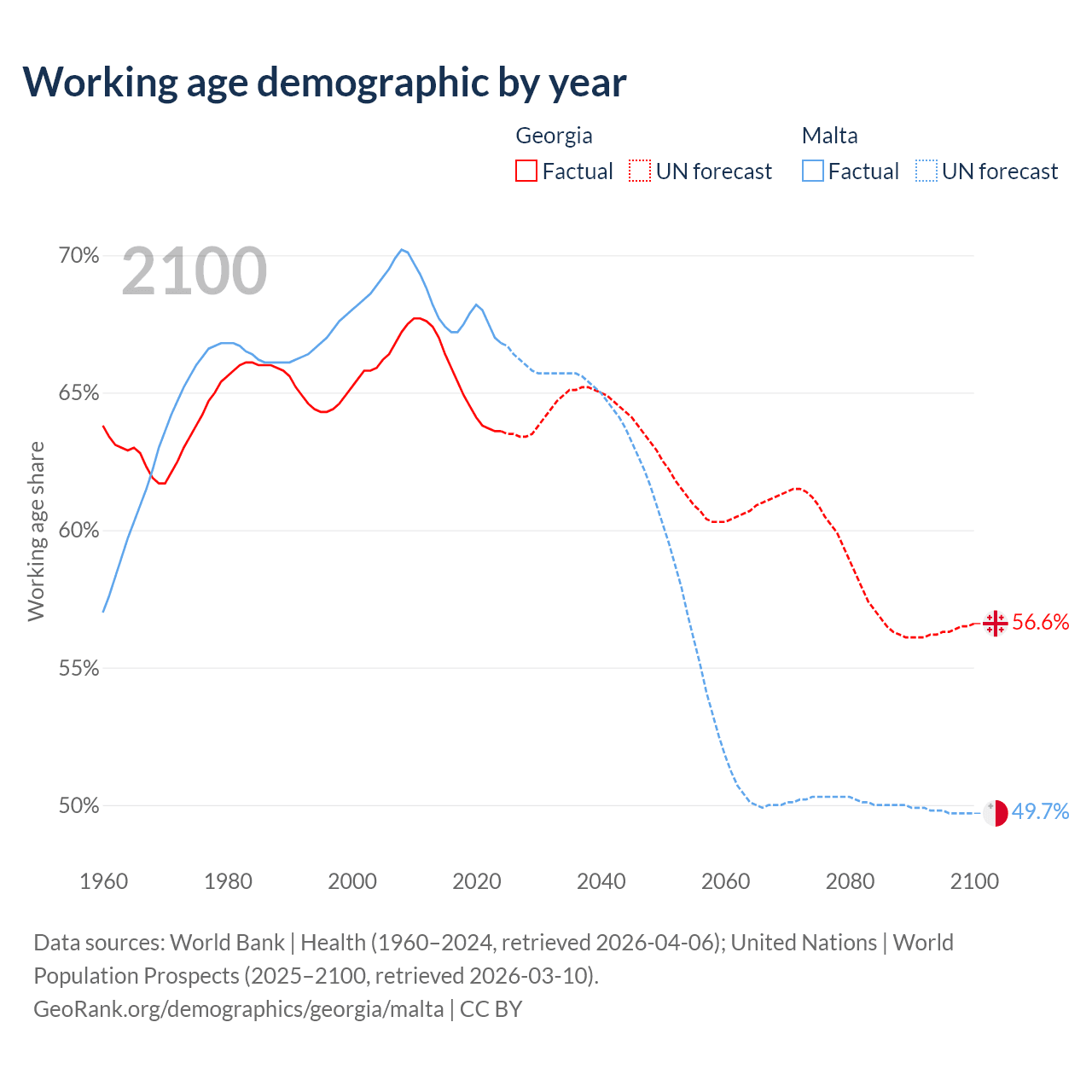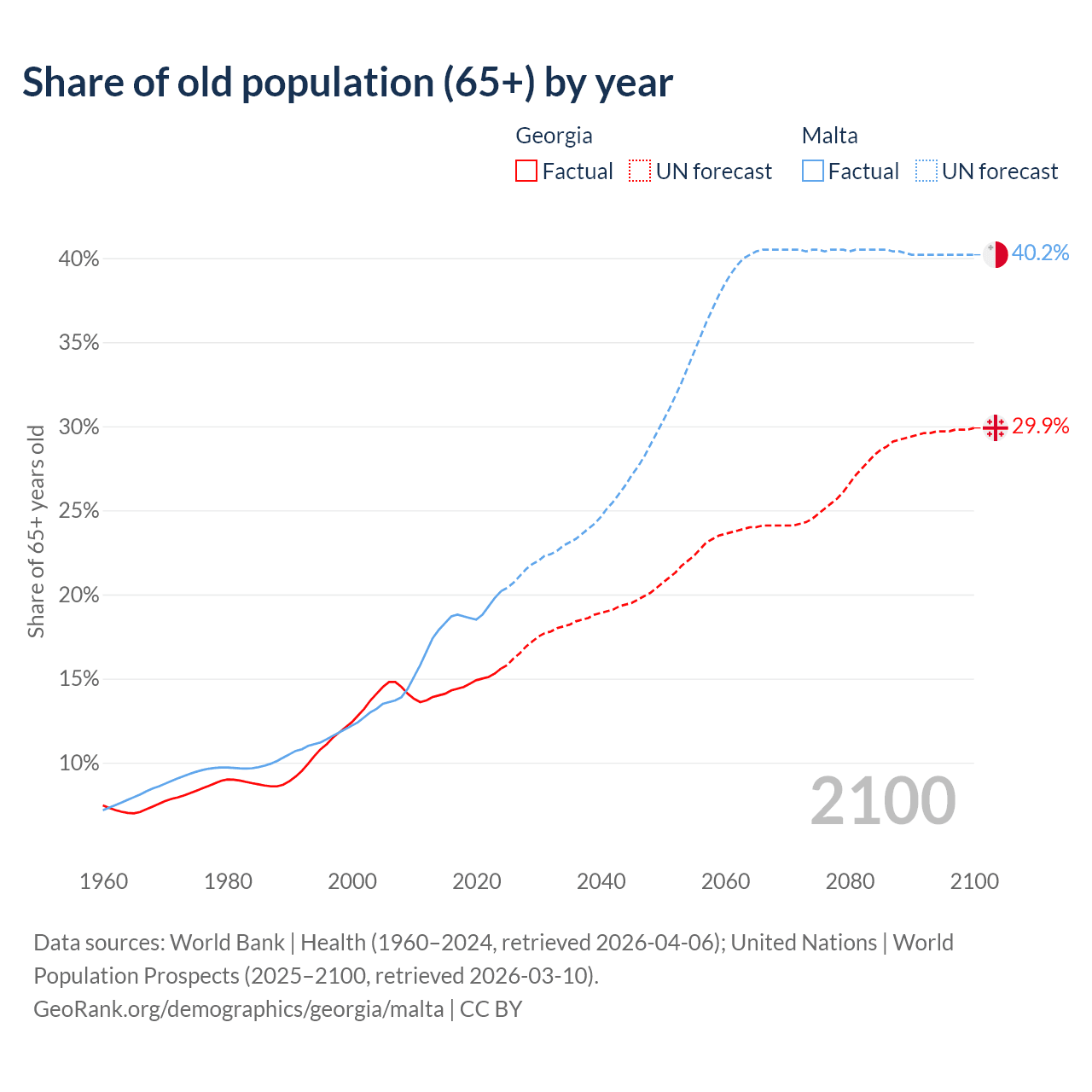 Median age Georgia vs Malta, 1960-2100