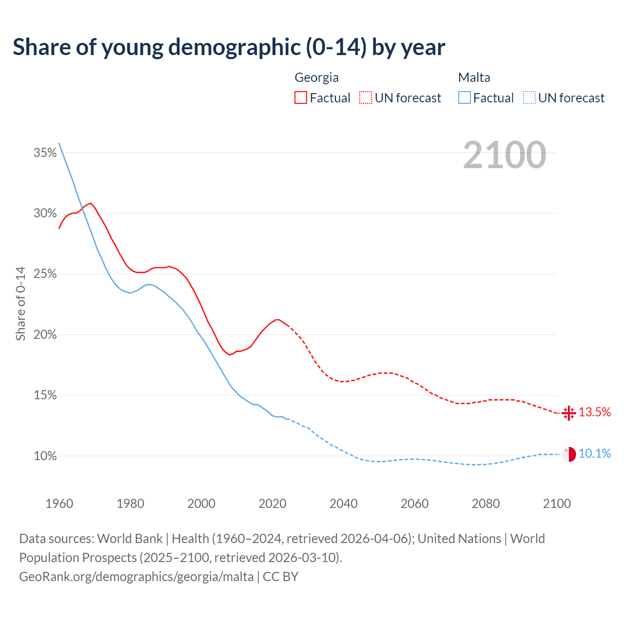 - The share of young demographic (0-15 years old) in Georgia is 20.8% vs 13% in Malta.