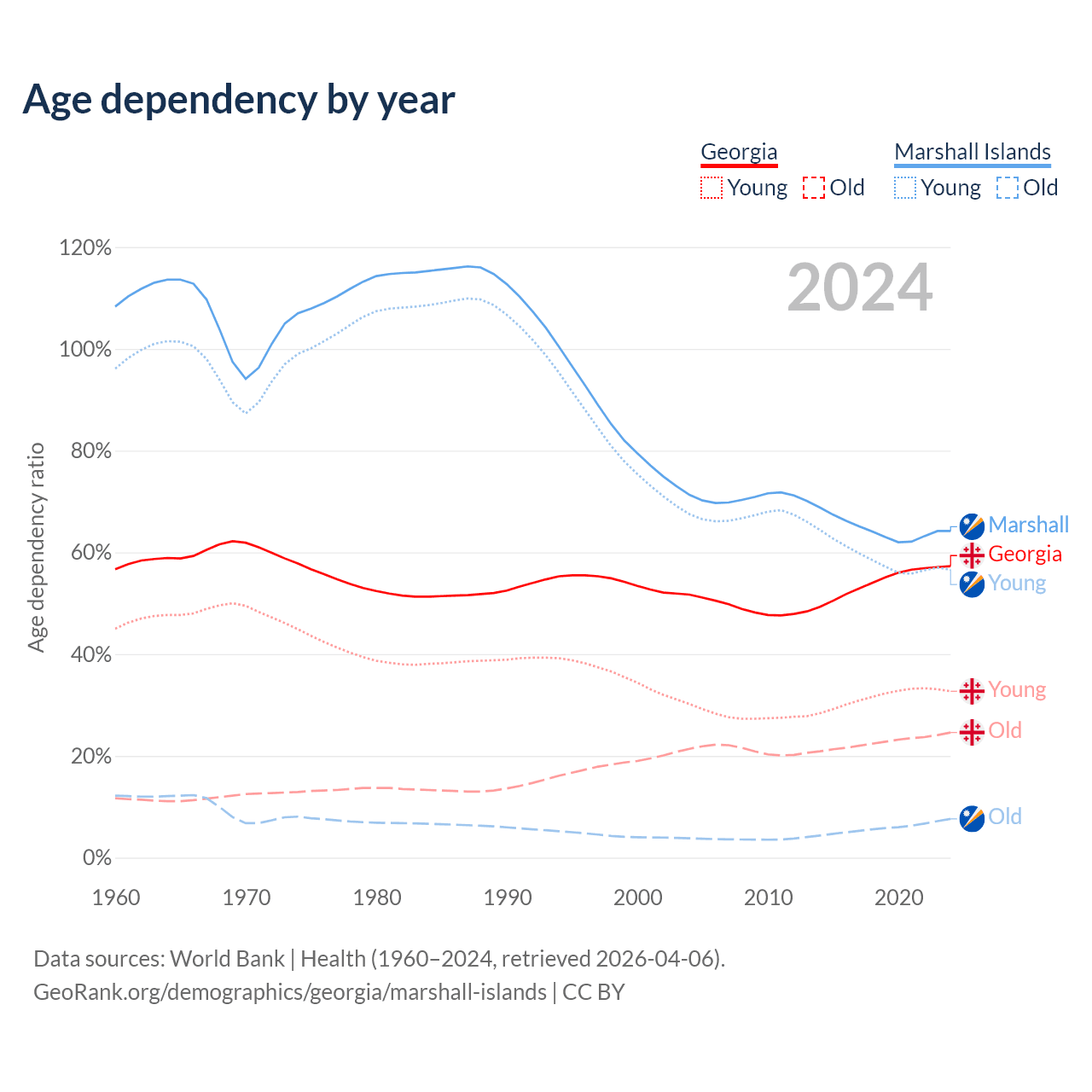 - The share of old-age demographic (65+) in Georgia is 15.6% vs 4.64% in the Marshall Islands.
