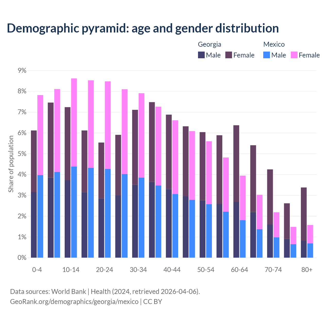 - Georgia is ranked 59/196 by median age (oldest to youngest) vs 102/196 for Mexico.