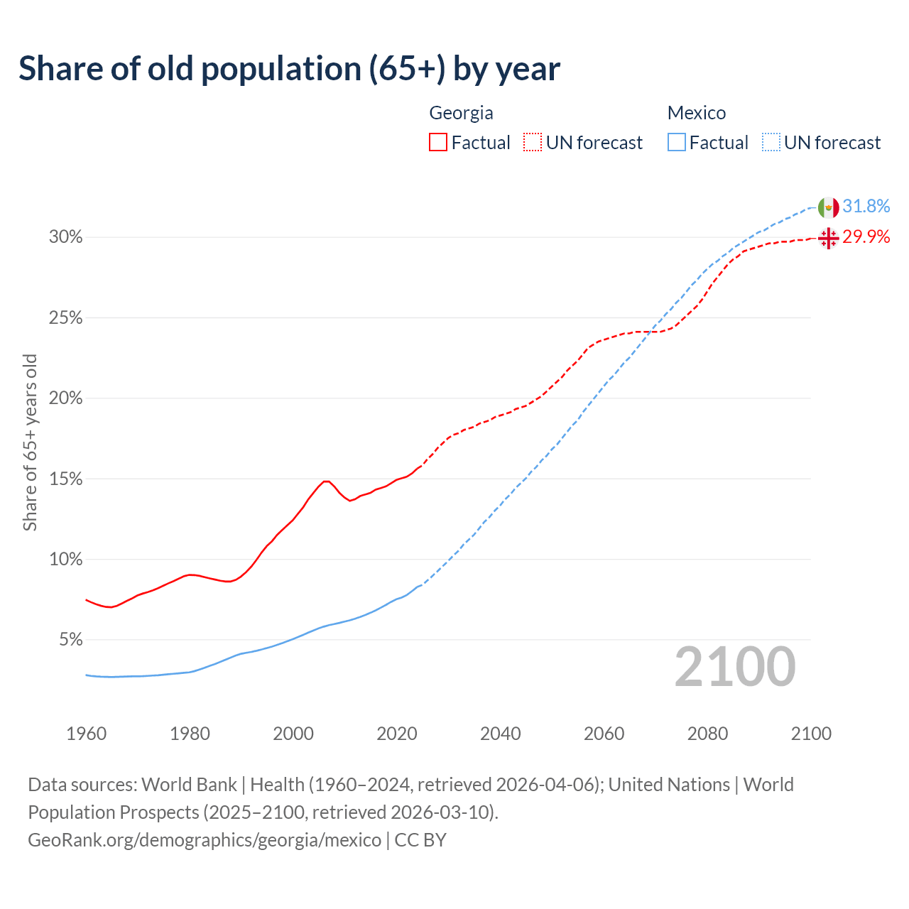 The share of older people aged 65 and over is 15.6% in Georgia and 8.25% in Mexico. Life expectancy in Georgia compared to Mexico .