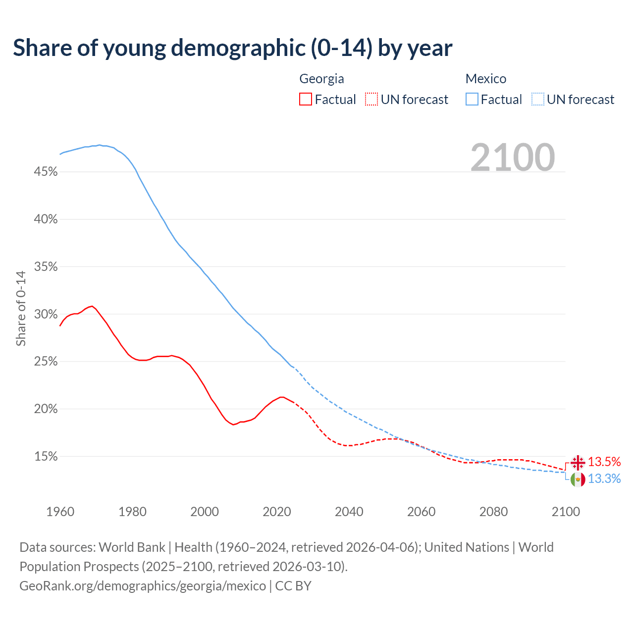 - The share of young demographic (0-15 years old) in Georgia is 20.8% vs 24.5% in Mexico.