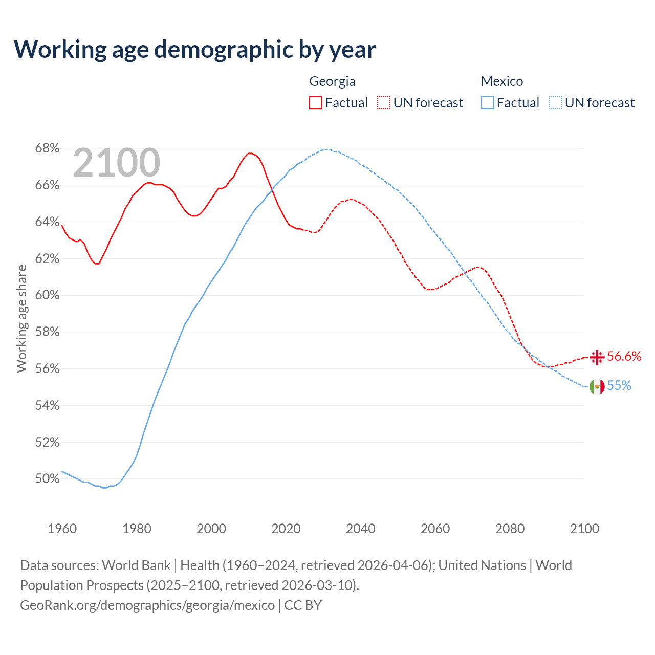 Median age Georgia vs Mexico, 1960-2100