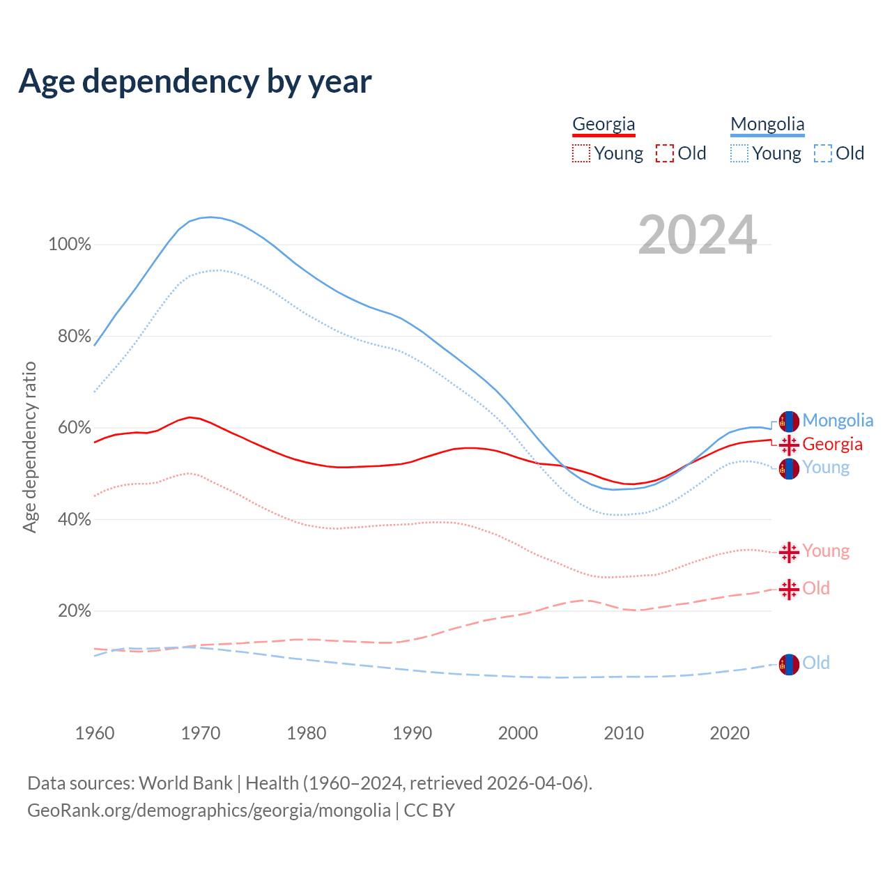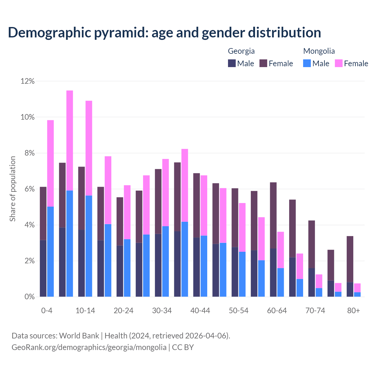 - Georgia is ranked 59/196 by median age (oldest to youngest) vs 117/196 for Mongolia.