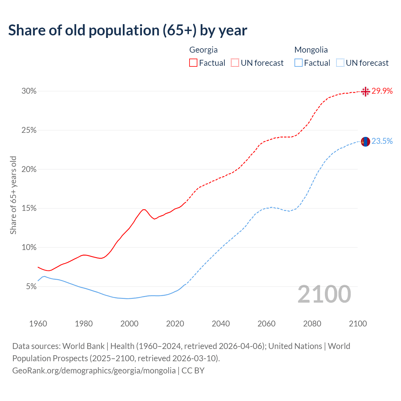 The share of older people aged 65 and over is 15.6% in Georgia and 5.14% in Mongolia. Life expectancy in Georgia compared to Mongolia .