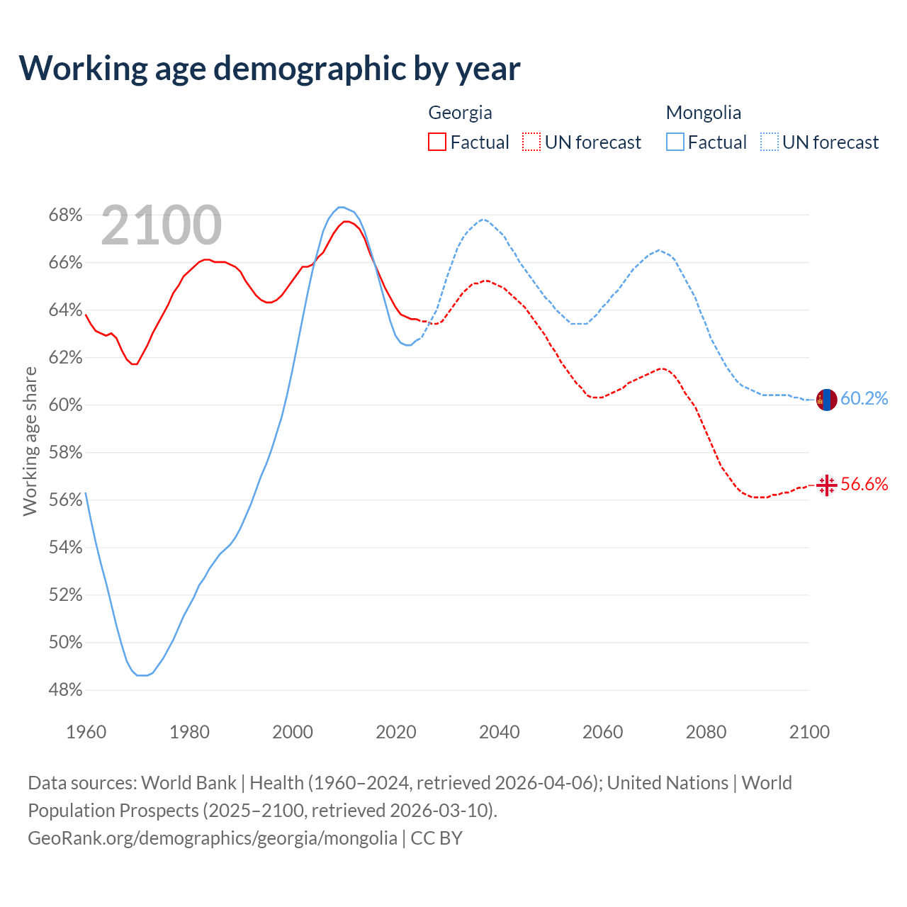 Median age Georgia vs Mongolia, 1960-2100