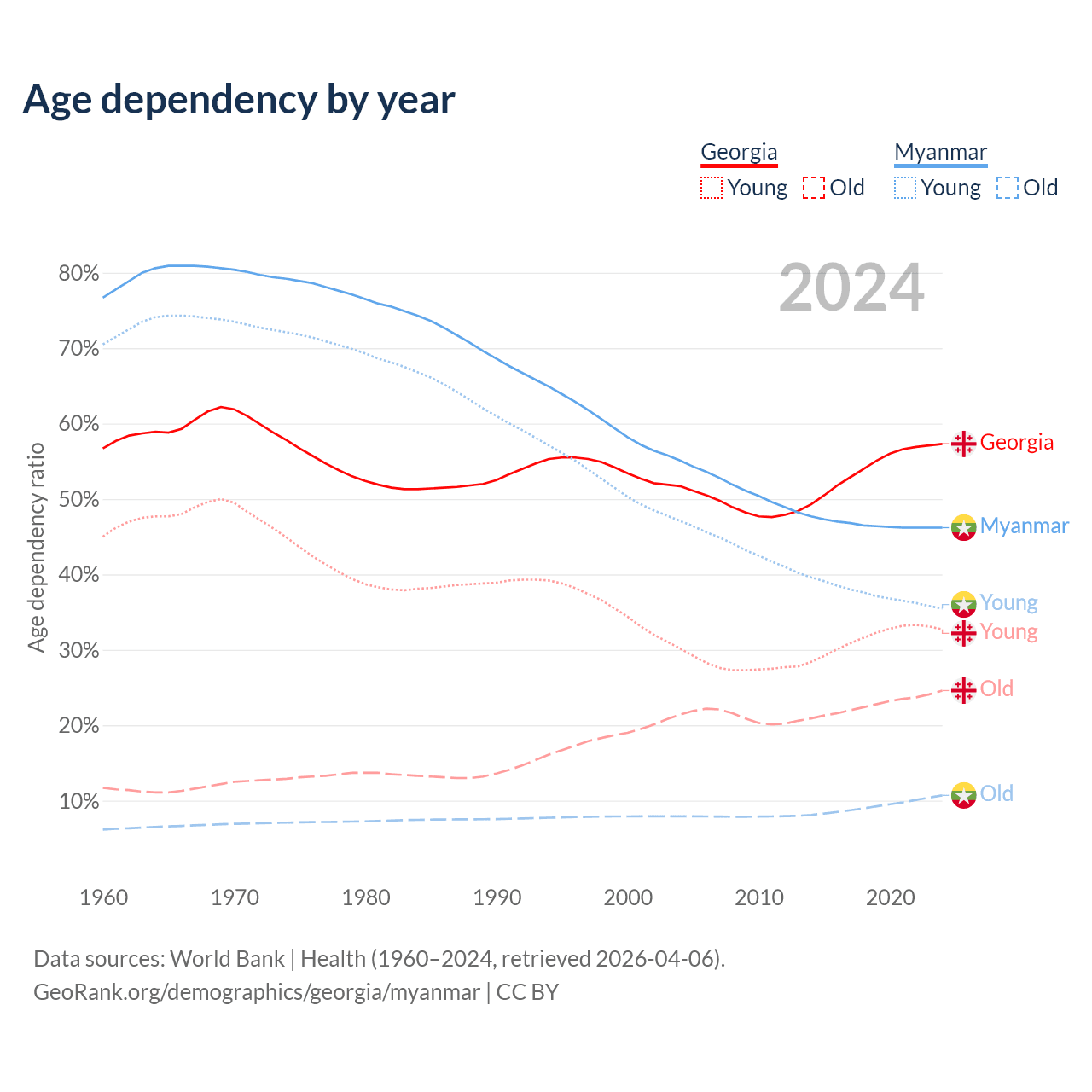 - Georgia is ranked 59/196 by median age (oldest to youngest) vs 96/196 for Myanmar.