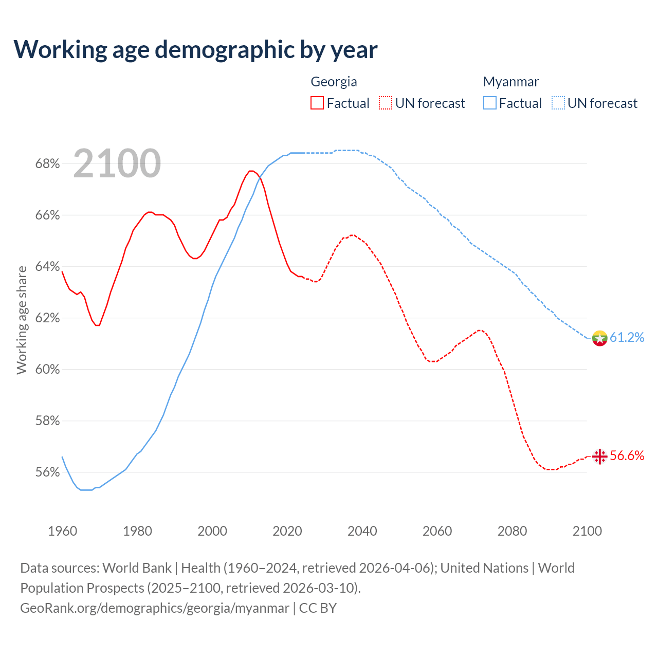 Median age Georgia vs Myanmar, 1960-2100