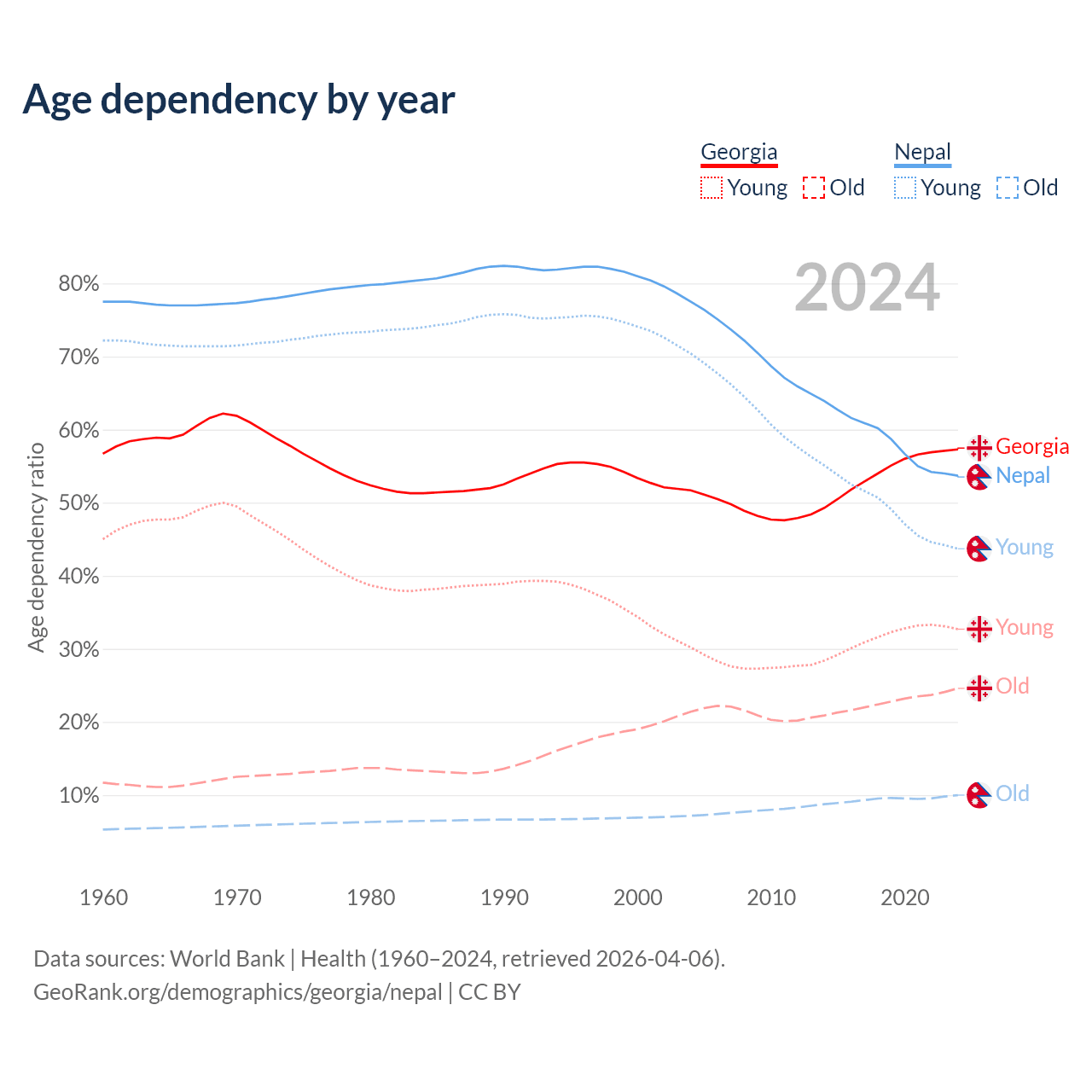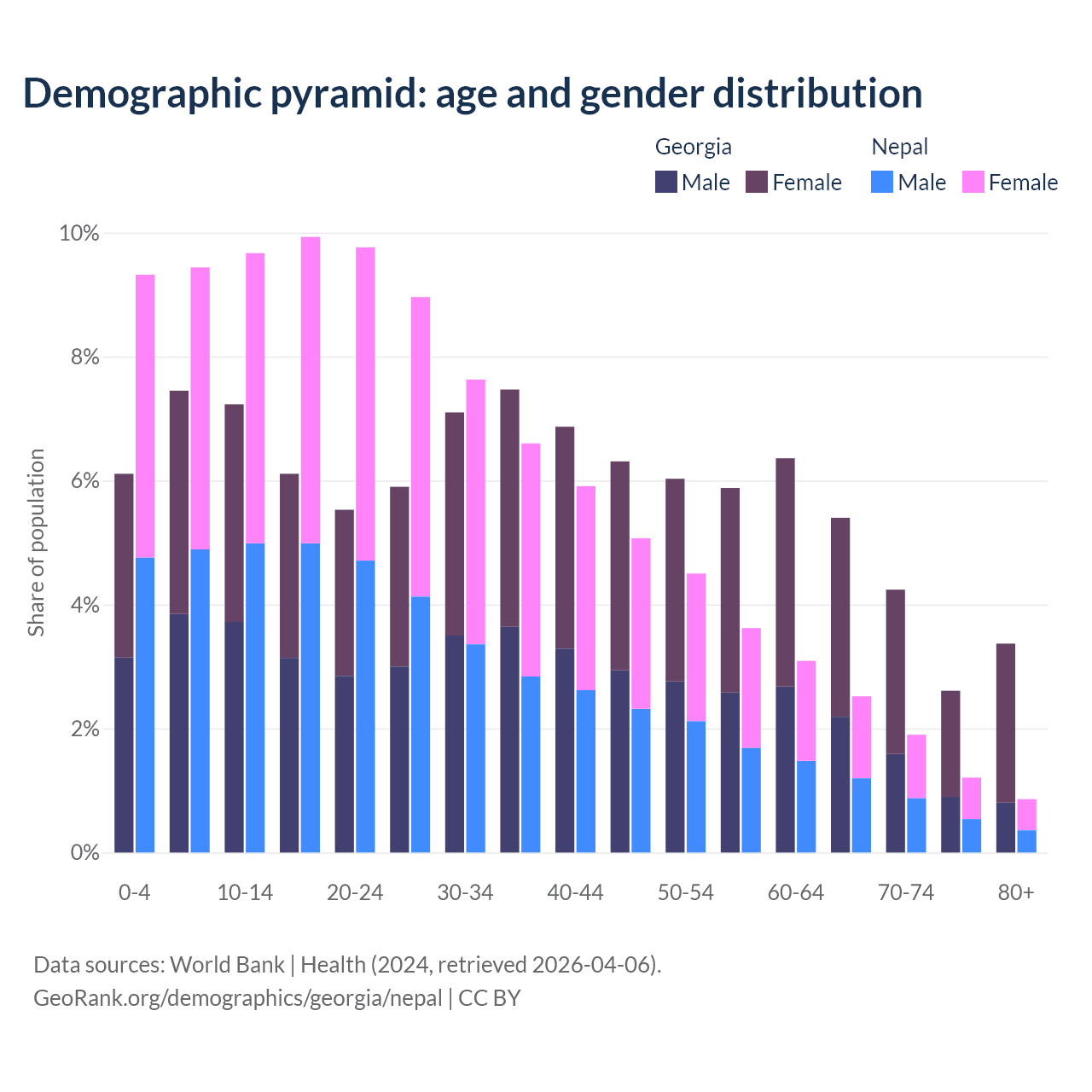 - The share of old-age demographic (65+) in Georgia is 15.6% vs 6.5% in Nepal.