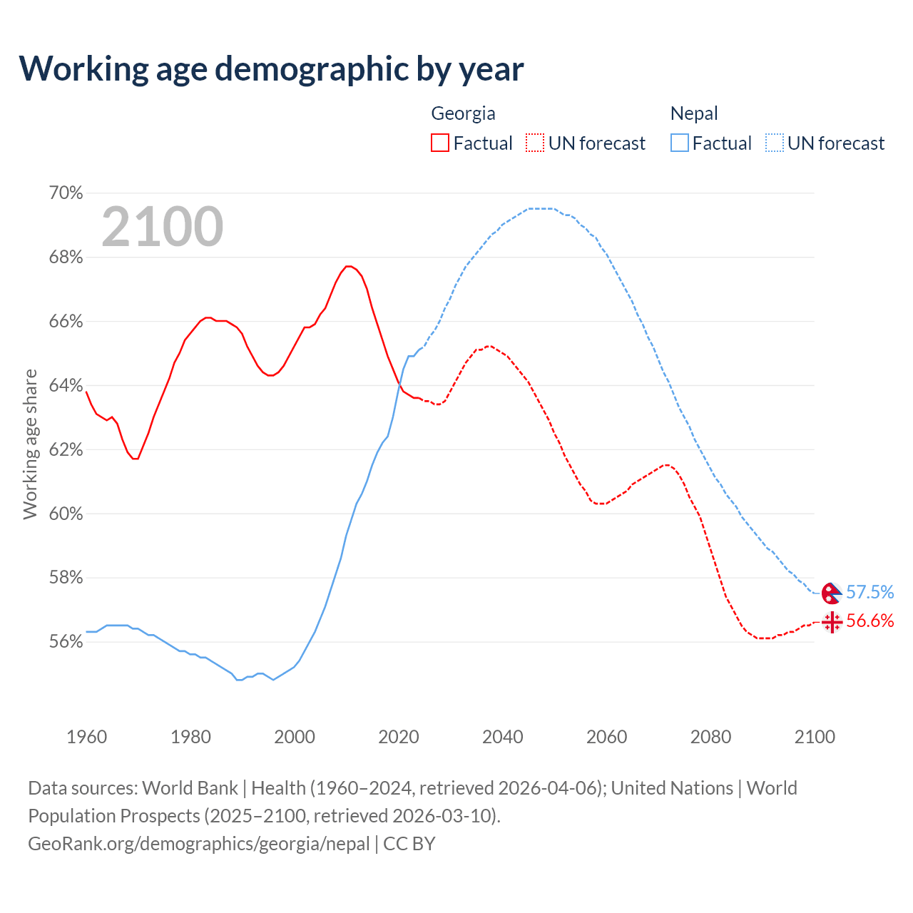 Median age Georgia vs Nepal, 1960-2100