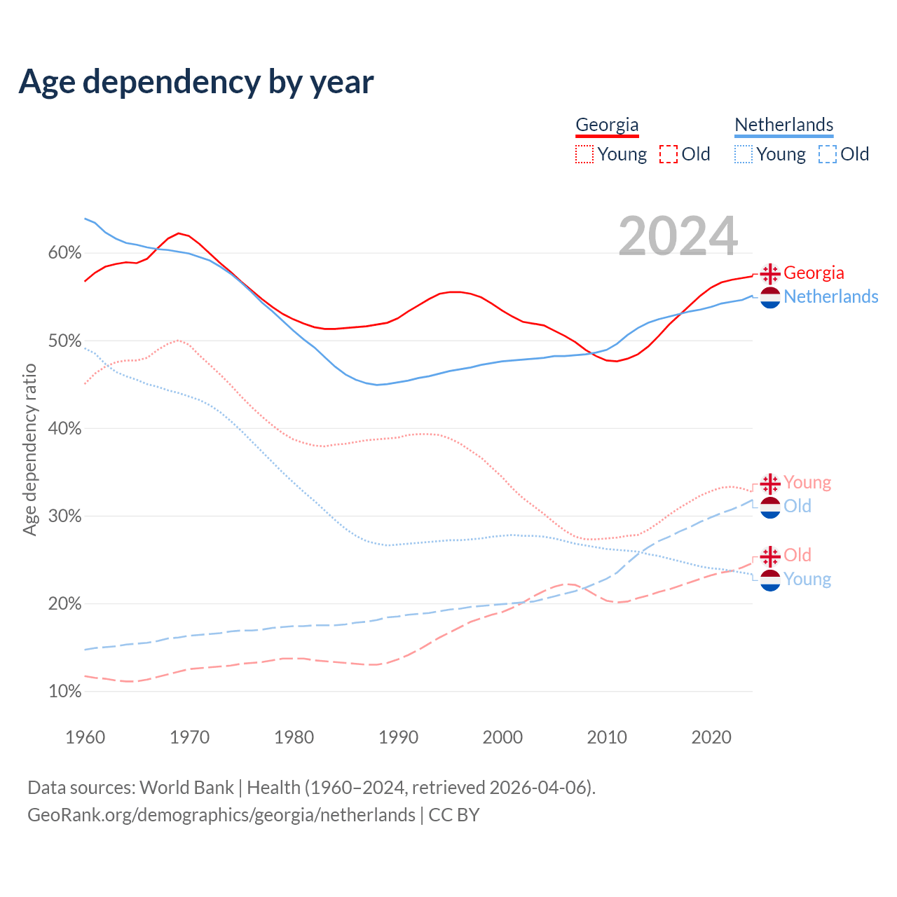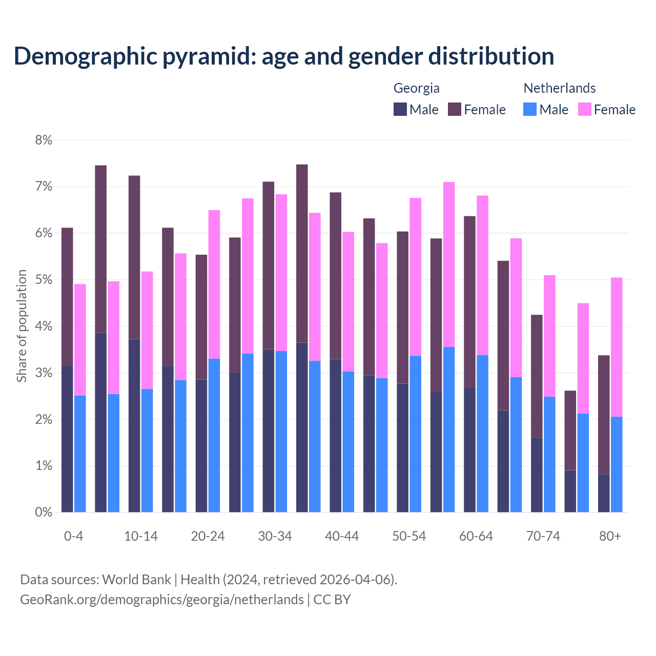- Georgia is ranked 59/196 by median age (oldest to youngest) vs 33/196 for the Netherlands.