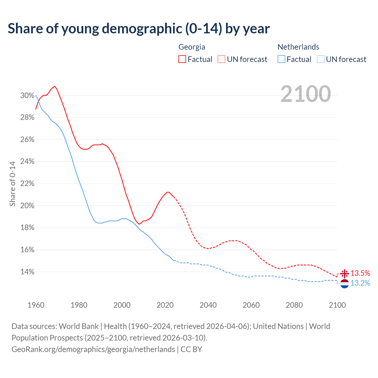 - The share of young demographic (0-15 years old) in Georgia is 20.8% vs 15% in the Netherlands.