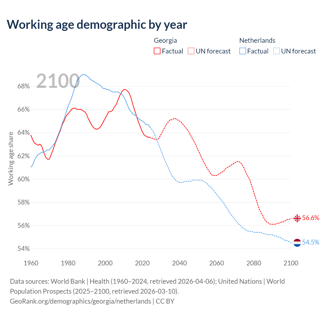 Median age Georgia vs Netherlands, 1960-2100