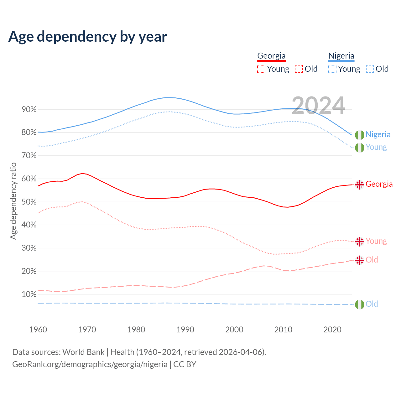 - Georgia is ranked 59/196 by median age (oldest to youngest) vs 178/196 for Nigeria.