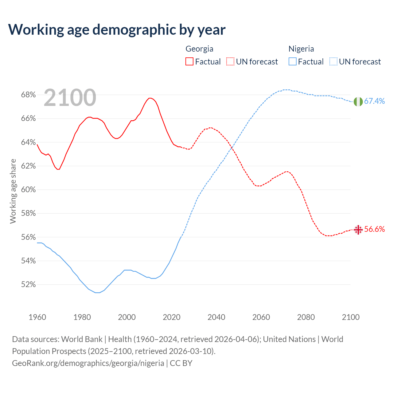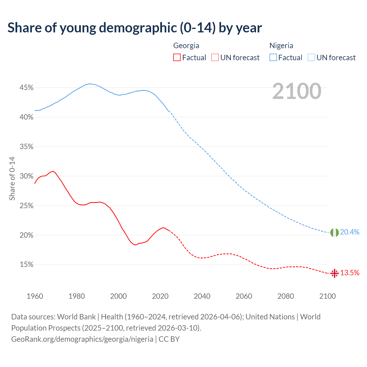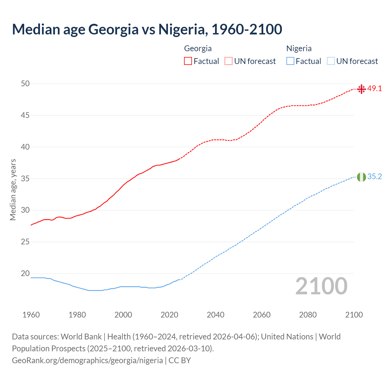 Median age Georgia vs Nigeria, 1960-2100