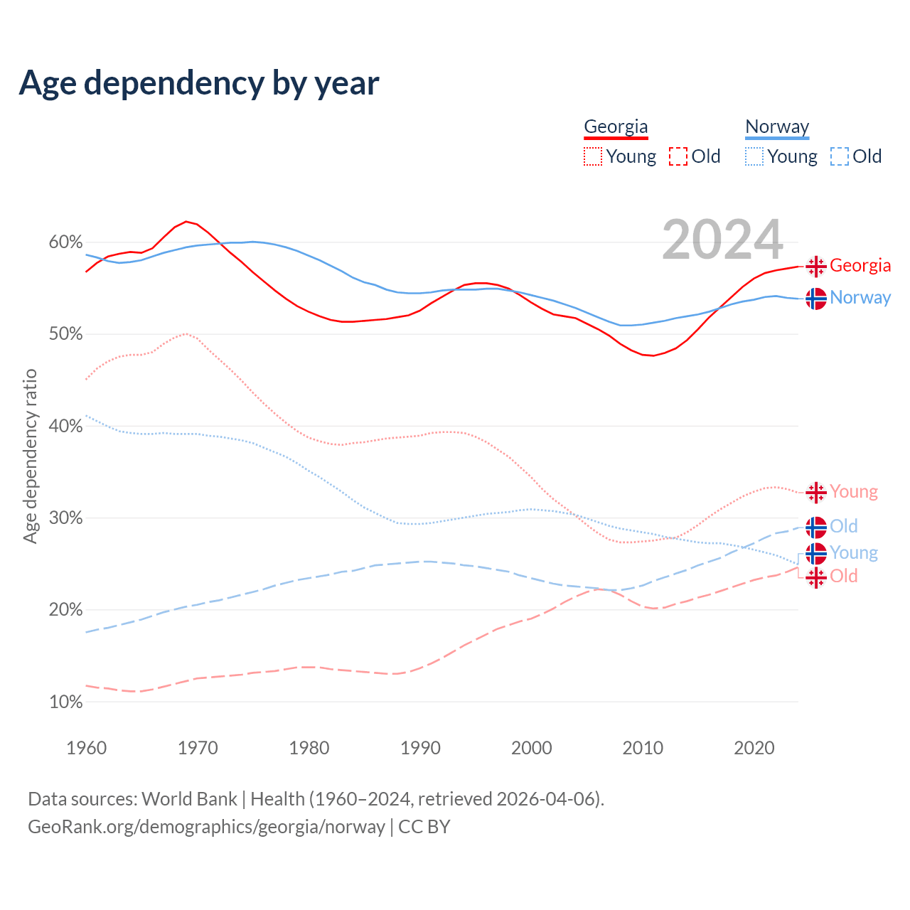 - The share of young demographic (0-15 years old) in Georgia is 20.8% vs 16.2% in Norway.