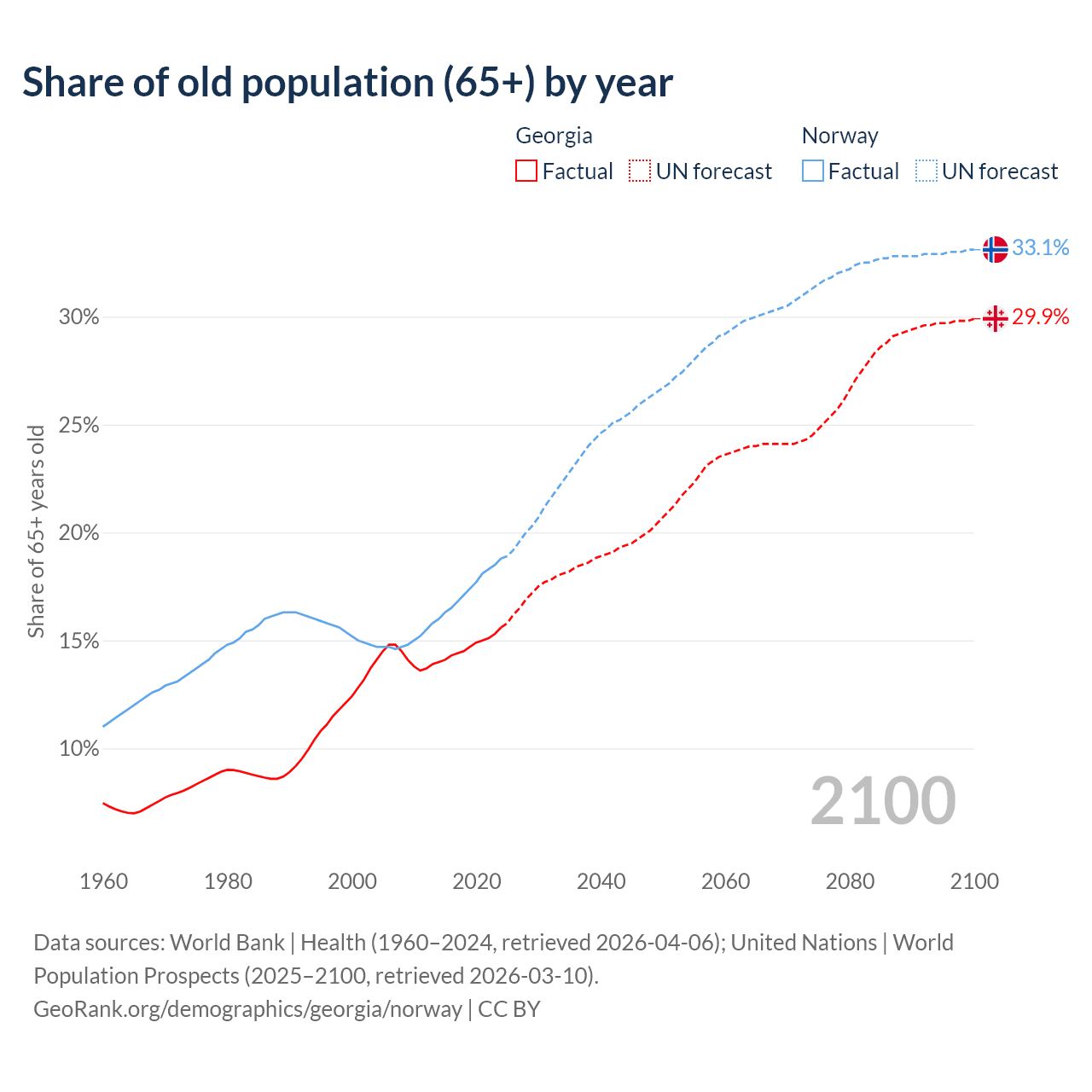 The share of older people aged 65 and over is 15.6% in Georgia and 18.8% in Norway. Life expectancy in Georgia compared to Norway .
