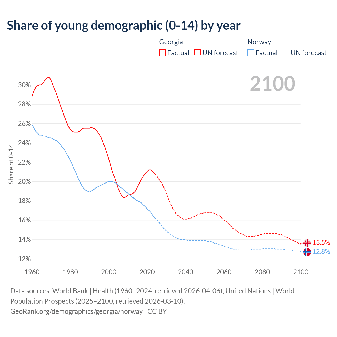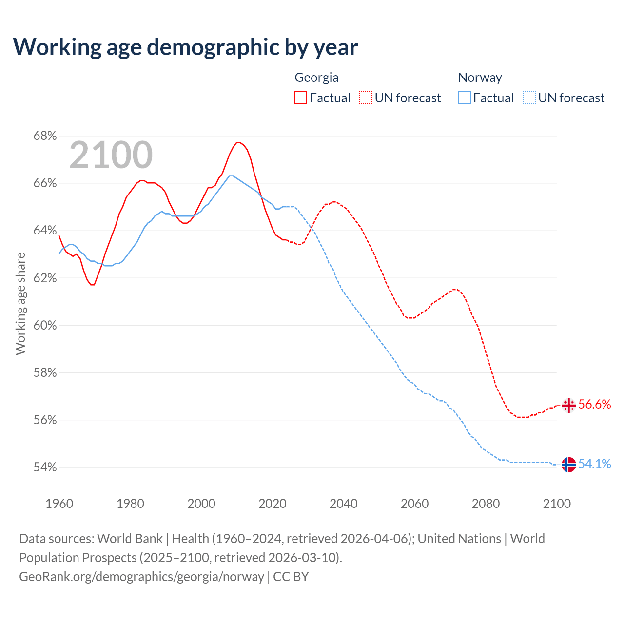 Median age Georgia vs Norway, 1960-2100
