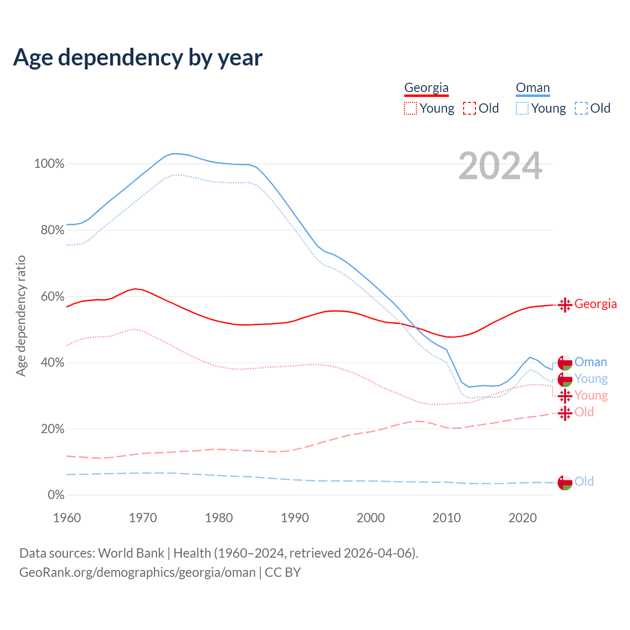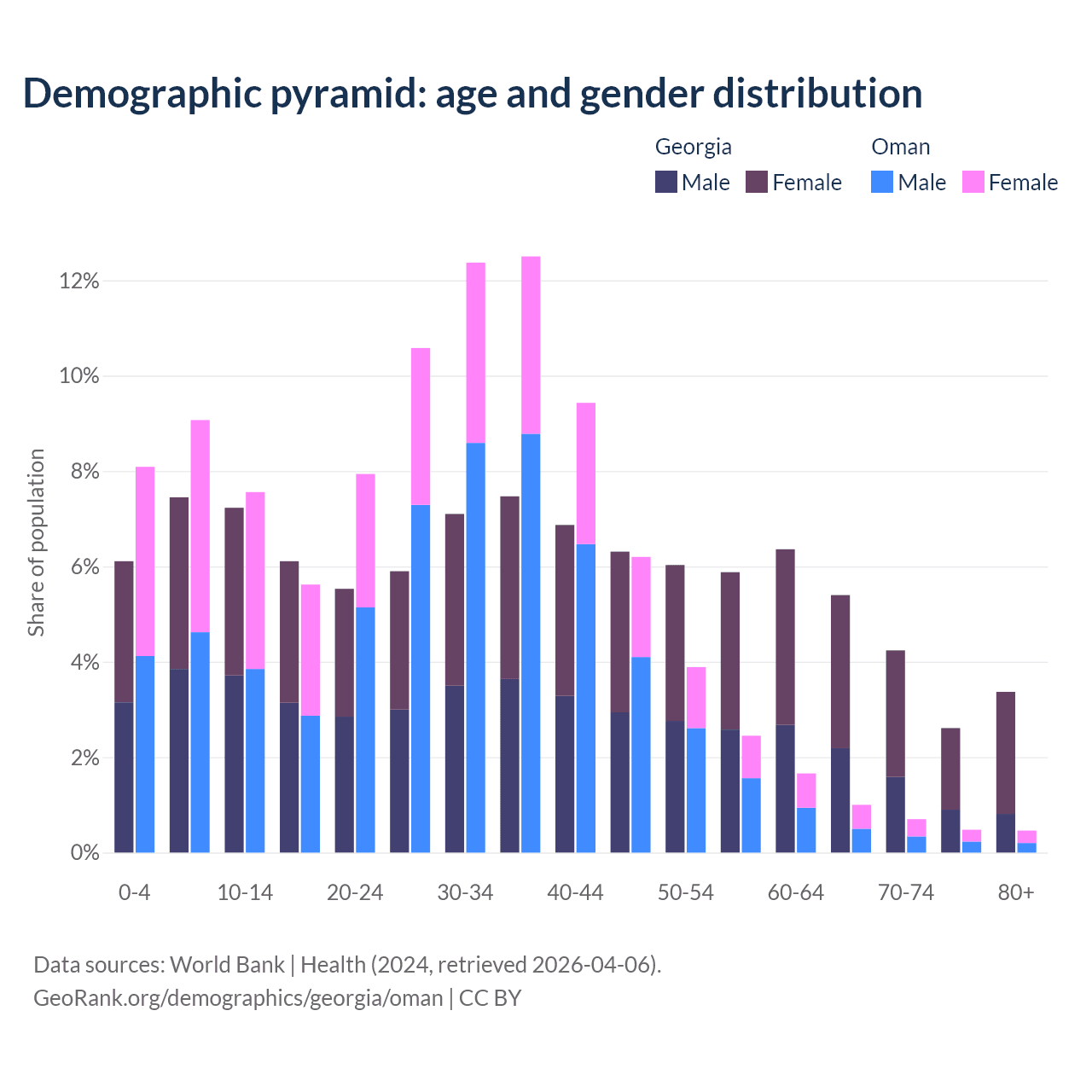 - Georgia is ranked 59/196 by median age (oldest to youngest) vs 101/196 for Oman.
