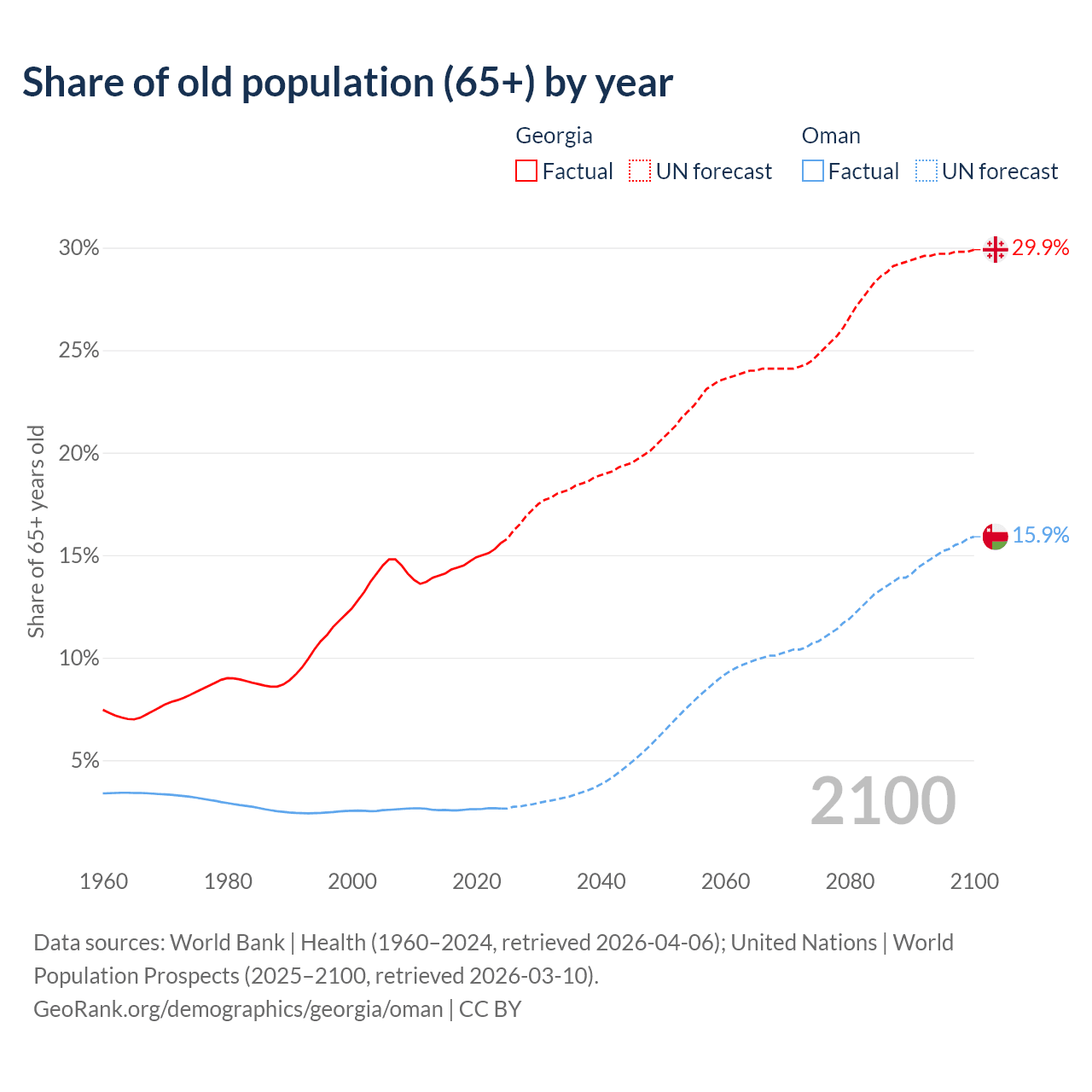 The share of older people aged 65 and over is 15.6% in Georgia and 2.64% in Oman. Life expectancy in Georgia compared to Oman .