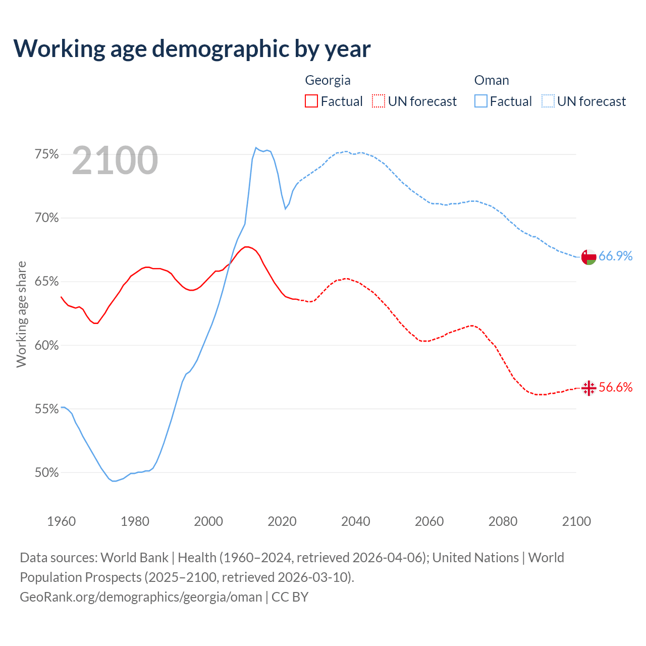 - Georgia has 2.35M working age adults (aged 15-64) vs 4.19M in Oman.