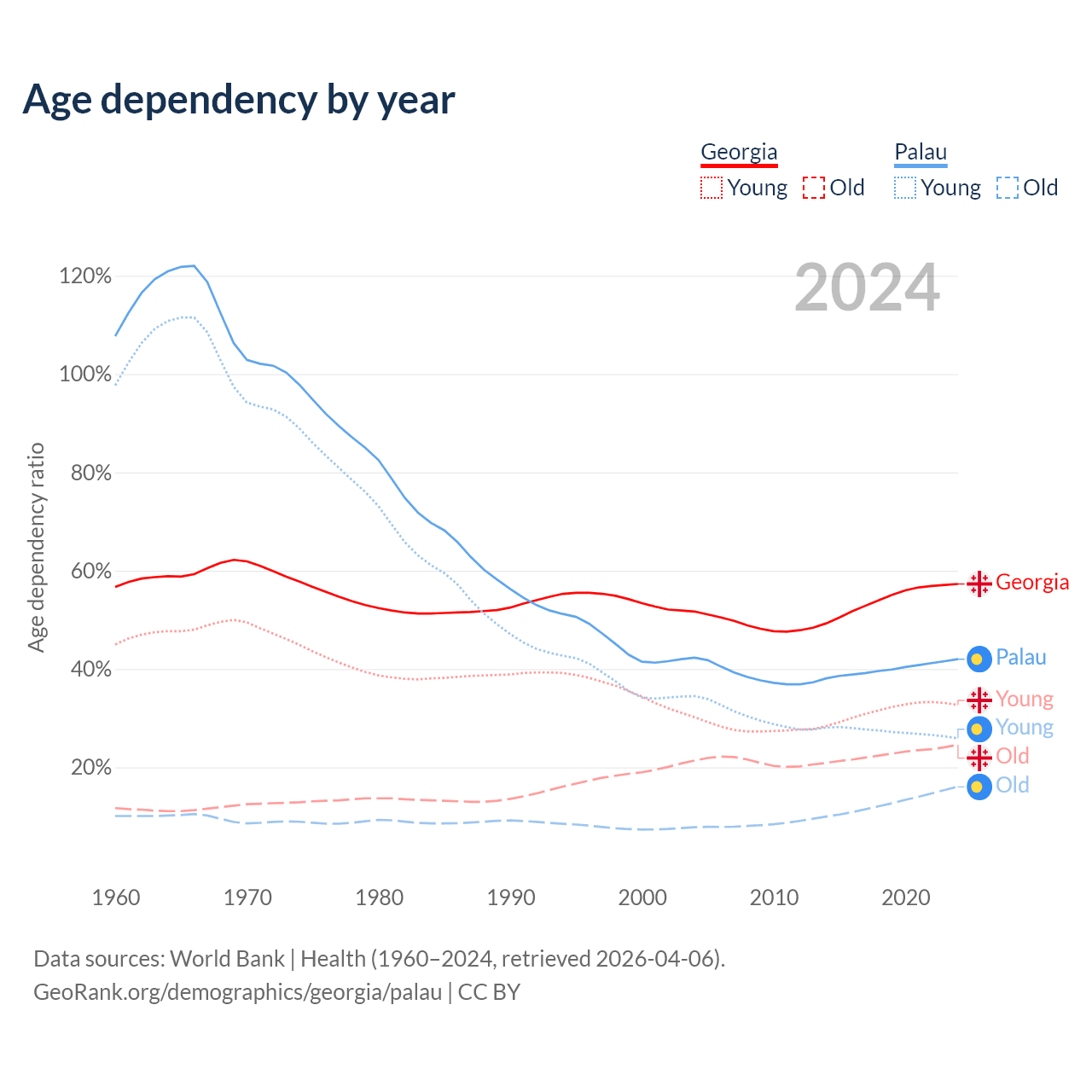 - The share of old-age demographic (65+) in Georgia is 15.6% vs 11.3% in Palau.