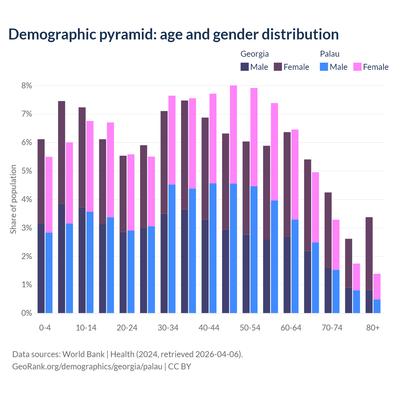 - Georgia is ranked 59/196 by median age (oldest to youngest) vs 53/196 for Palau.