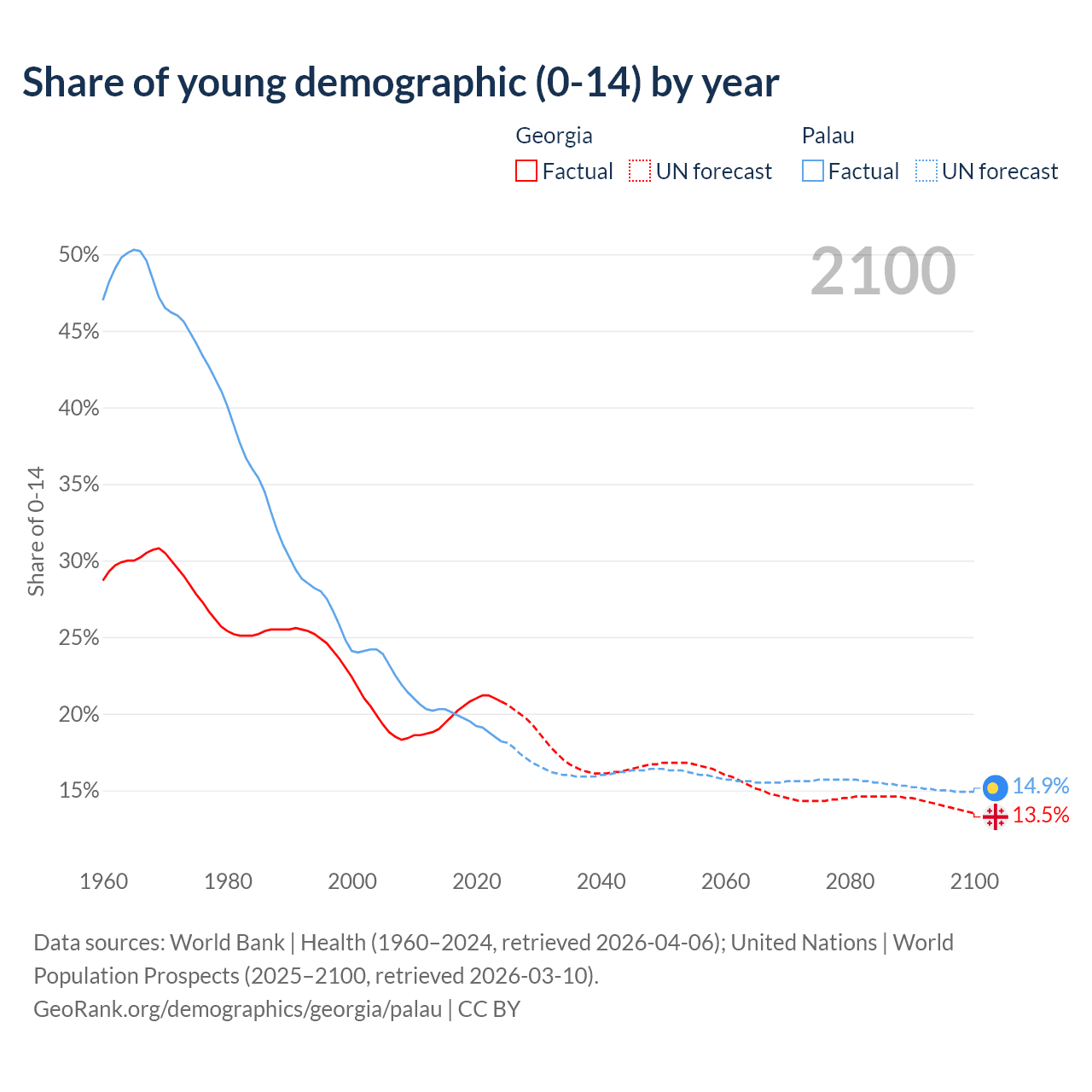 - The share of young demographic (0-15 years old) in Georgia is 20.8% vs 18.2% in Palau.