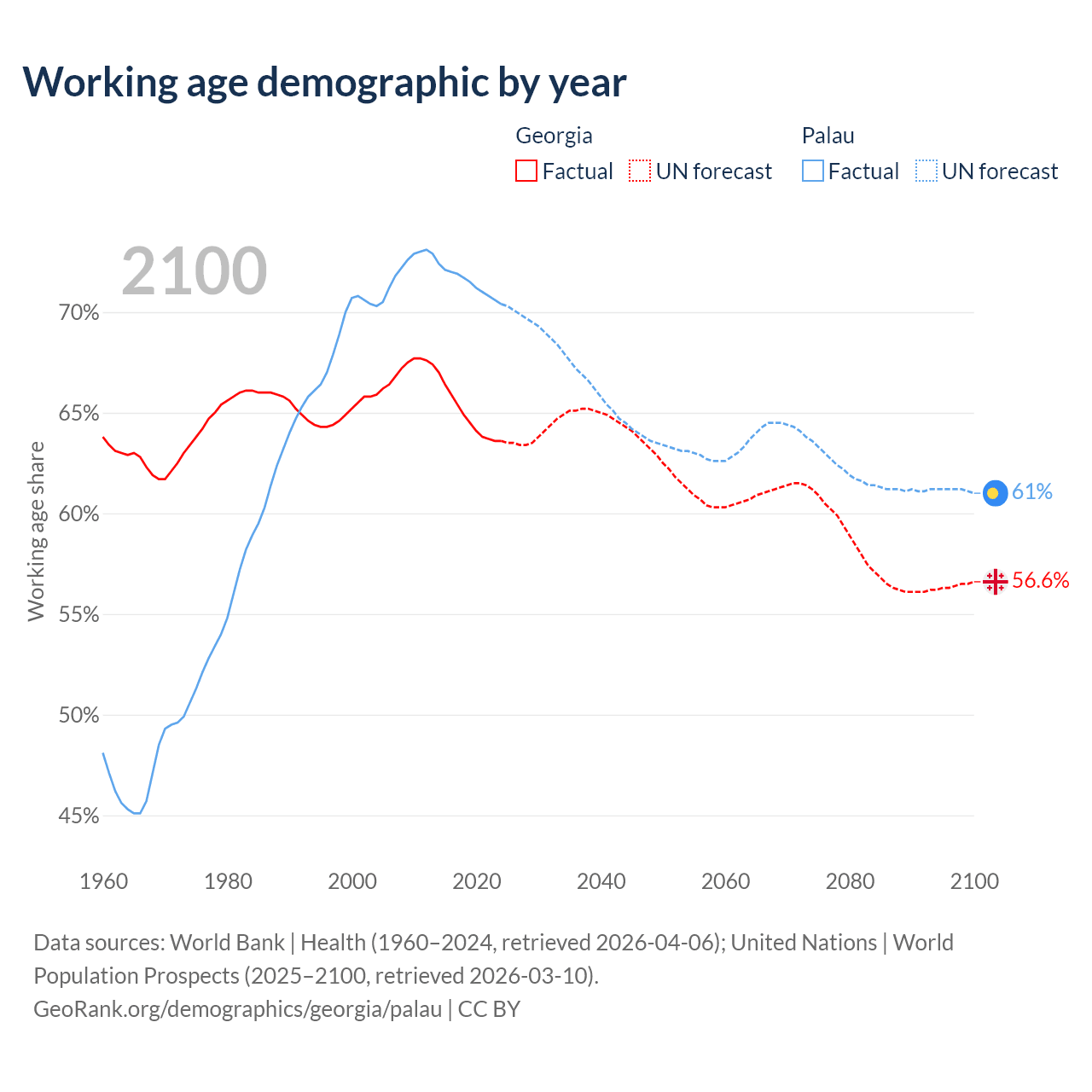 - Georgia has 2.35M working age adults (aged 15-64) vs 12.4K in Palau.