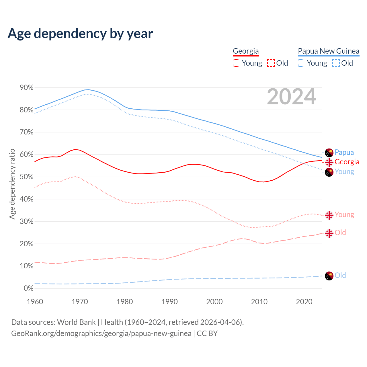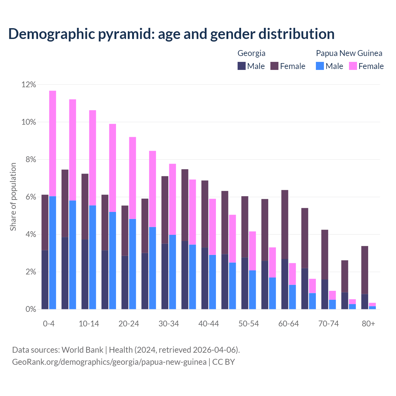 - The share of old-age demographic (65+) in Georgia is 15.6% vs 3.46% in Papua New Guinea.