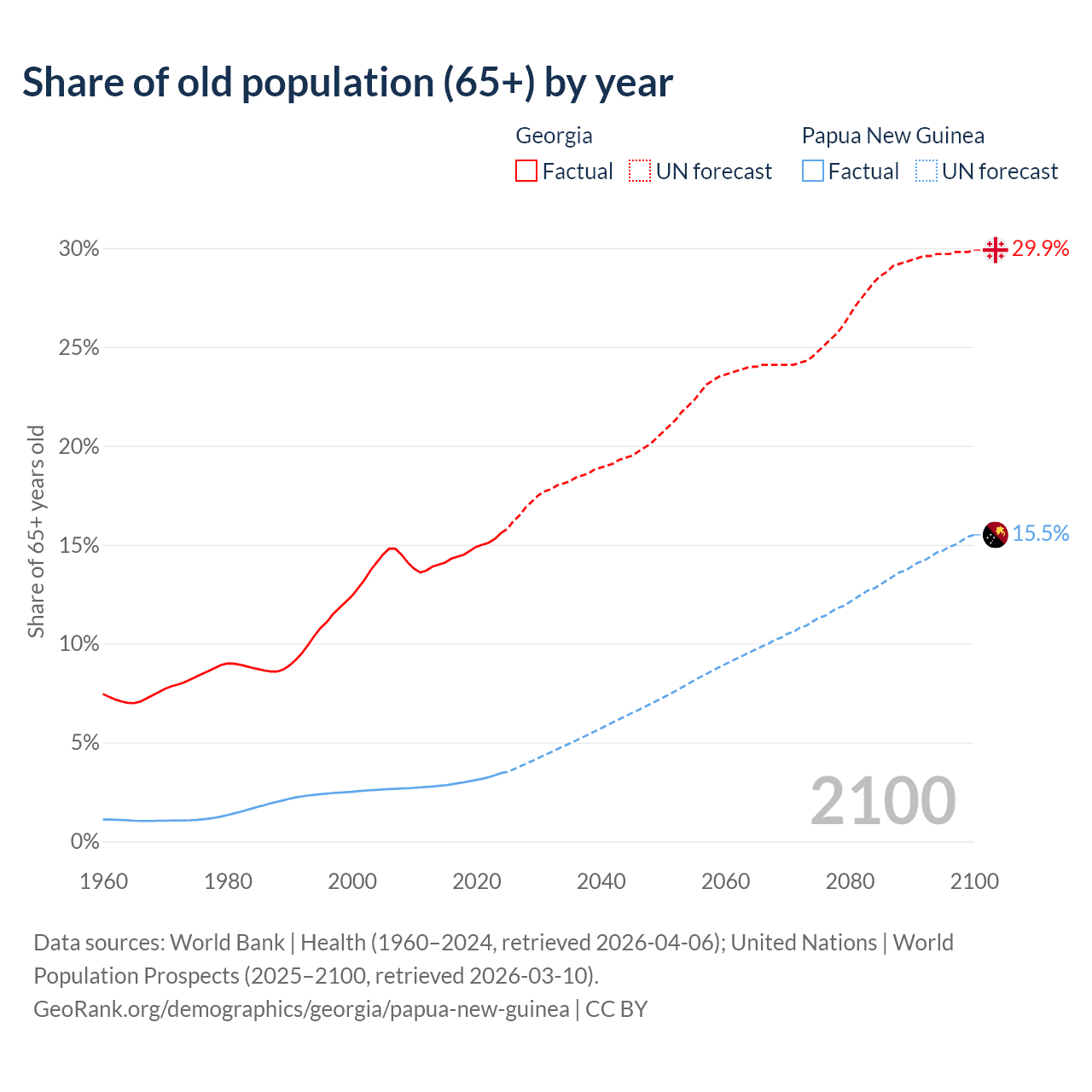 The share of older people aged 65 and over is 15.6% in Georgia and 3.46% in Papua New Guinea. Life expectancy in Georgia compared to Papua New Guinea .