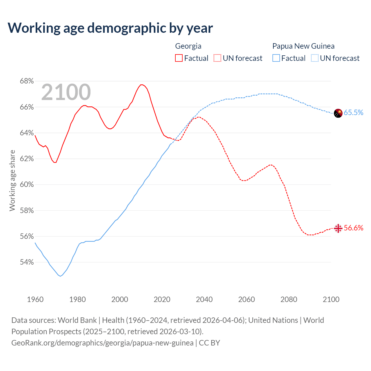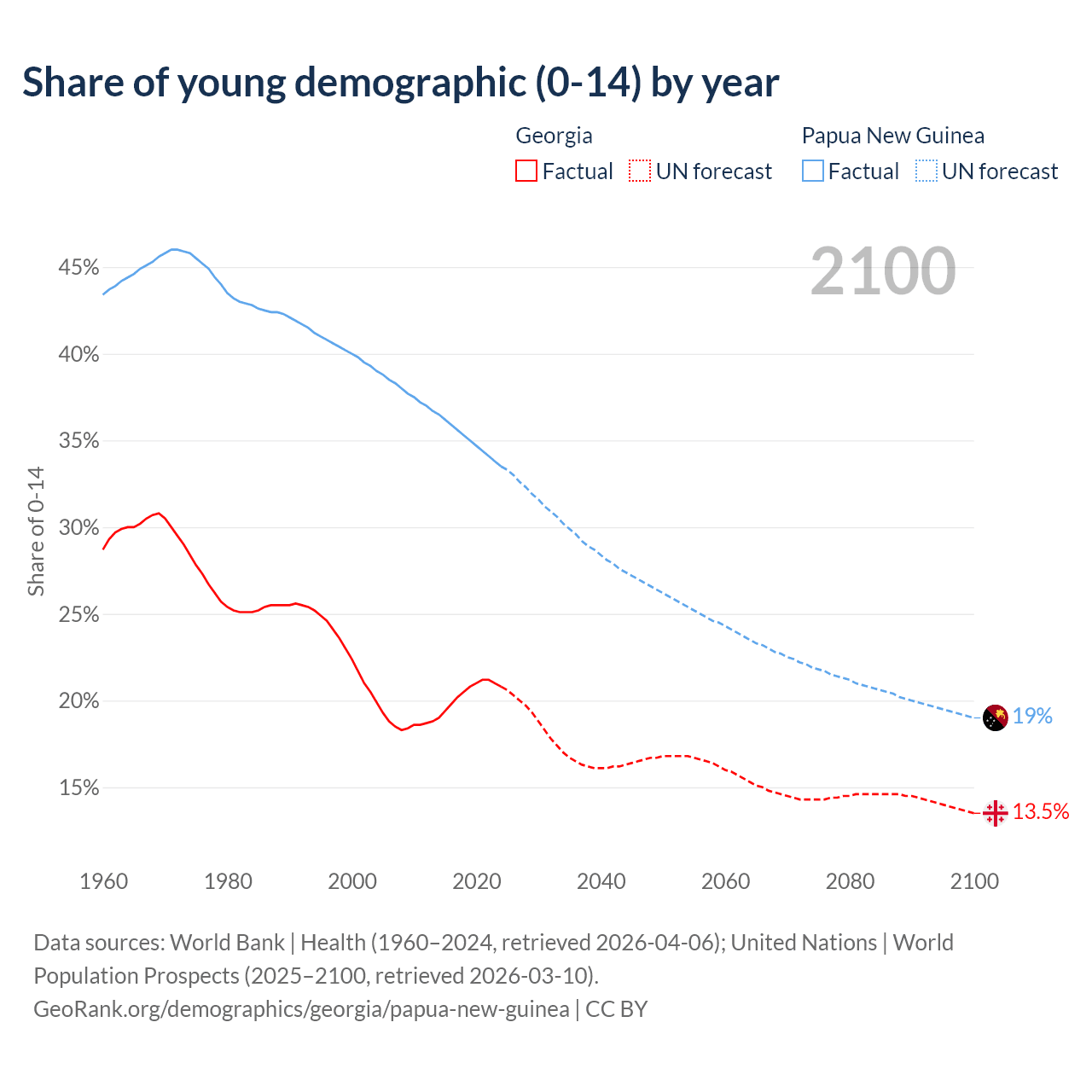 Median age Georgia vs Papua New Guinea, 1960-2100