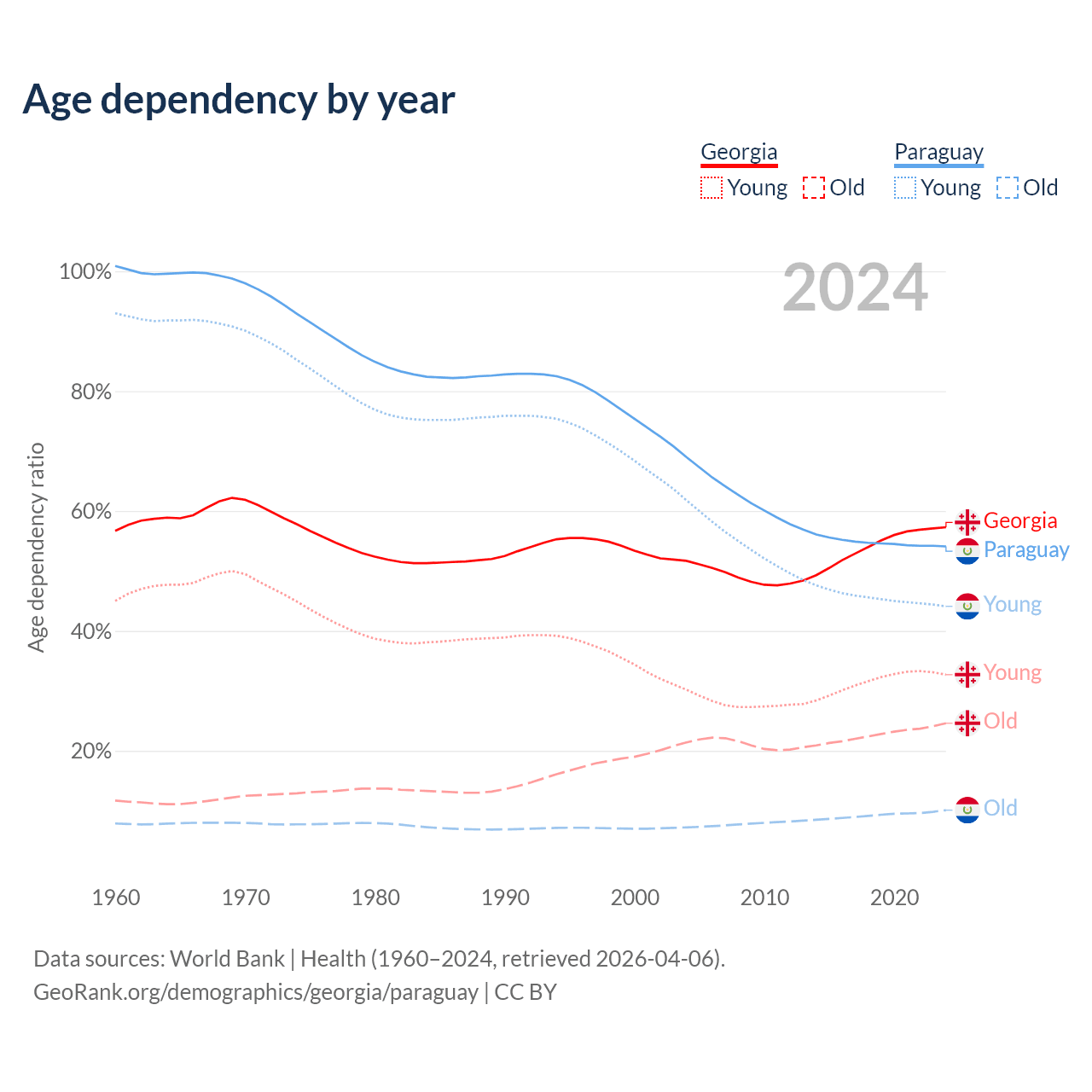 The share of older people aged 65 and over is 15.6% in Georgia and 6.54% in Paraguay. Life expectancy in Georgia compared to Paraguay .