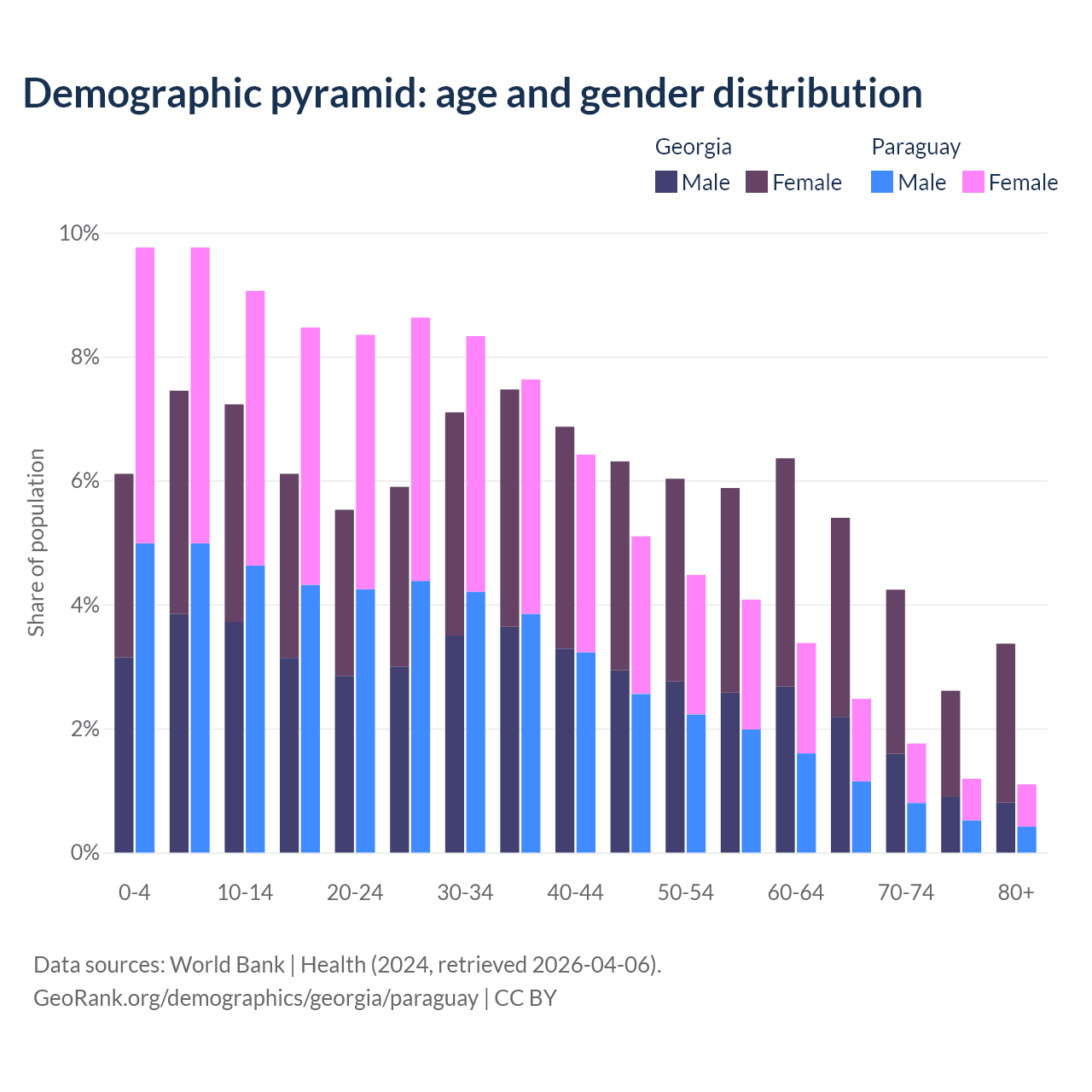 - Georgia is ranked 59/196 by median age (oldest to youngest) vs 118/196 for Paraguay.