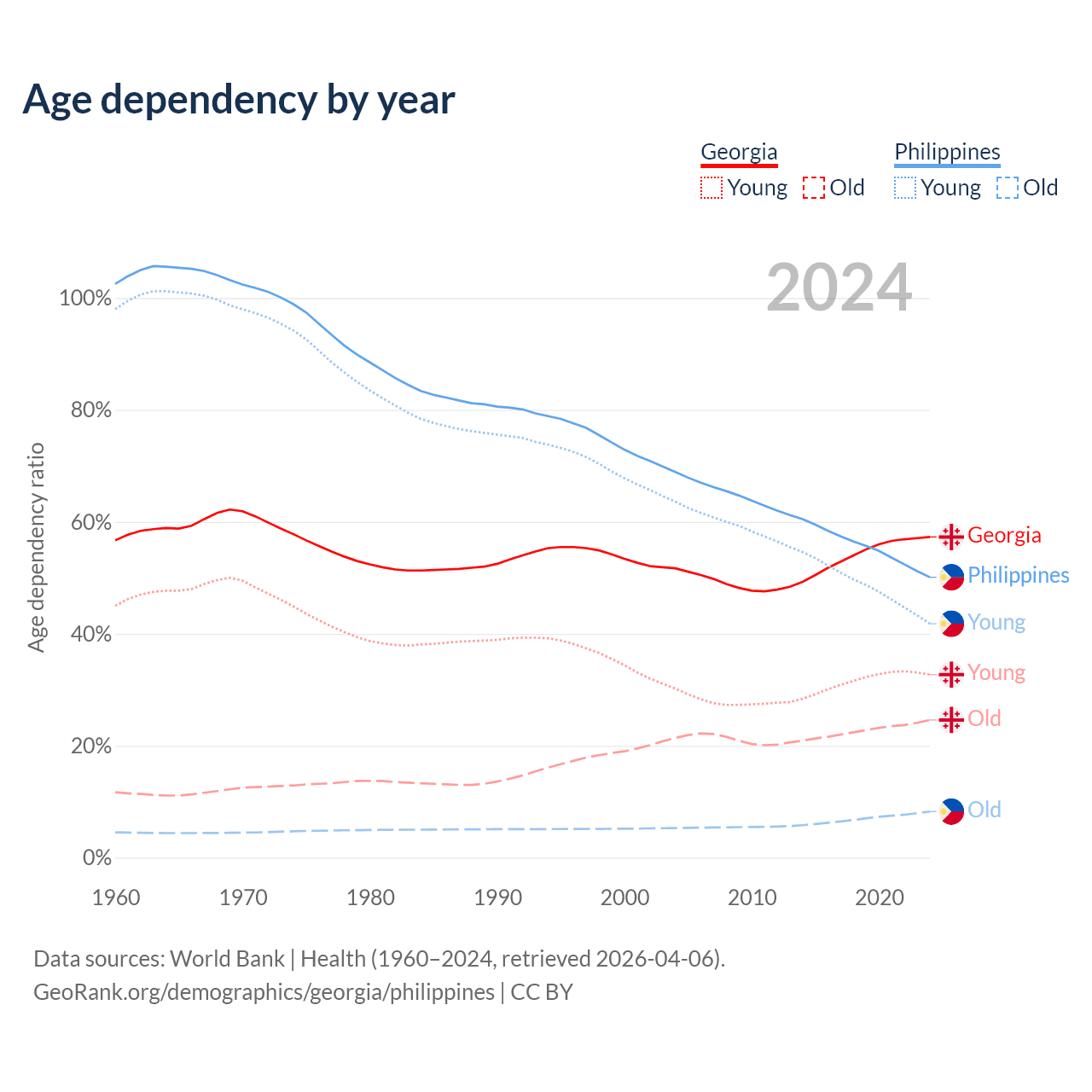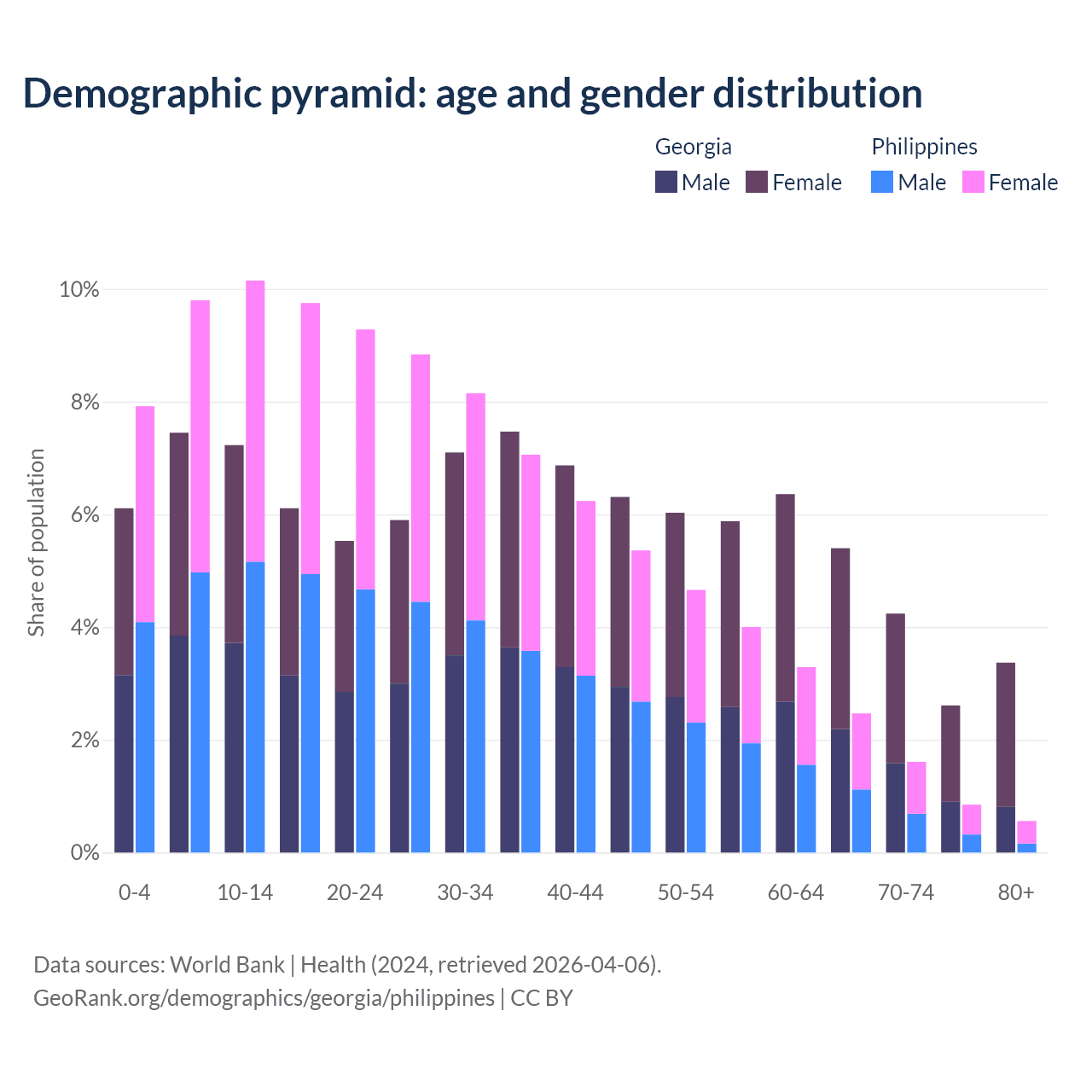 - Georgia is ranked 59/196 by median age (oldest to youngest) vs 123/196 for the Philippines.
