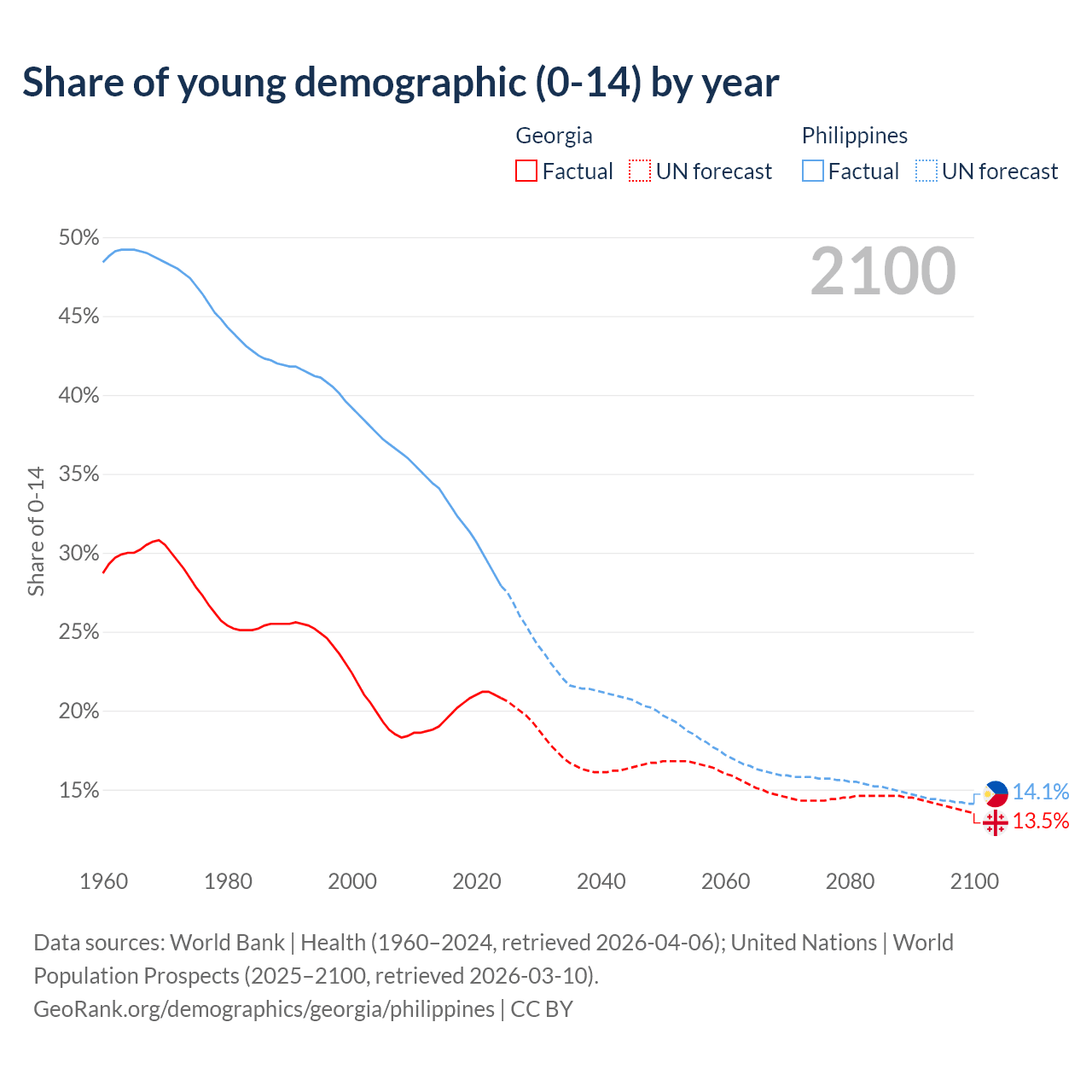 - The share of young demographic (0-15 years old) in Georgia is 20.8% vs 27.9% in the Philippines.