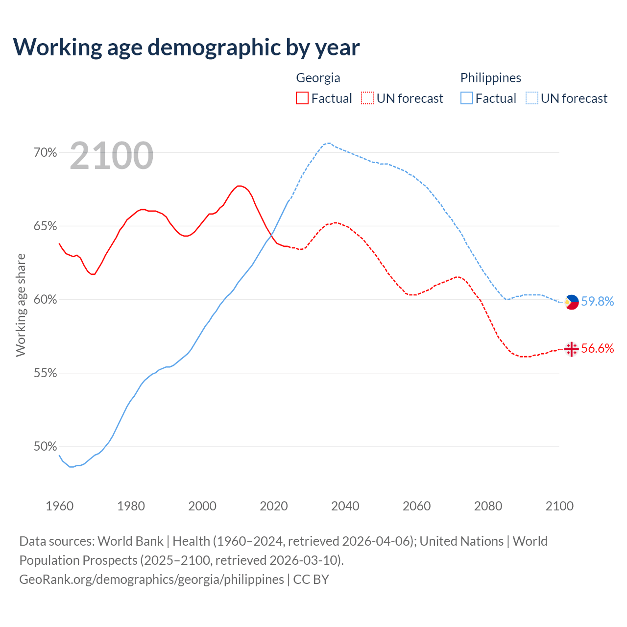 - Georgia has 2.35M working age adults (aged 15-64) vs 78.6M in the Philippines.