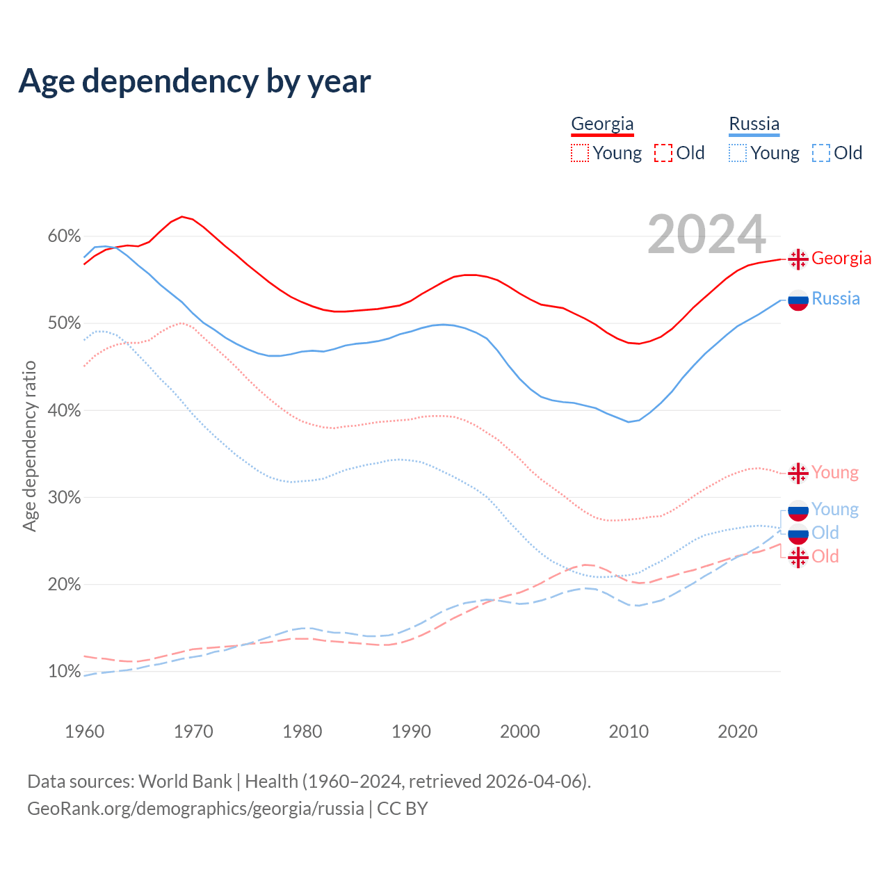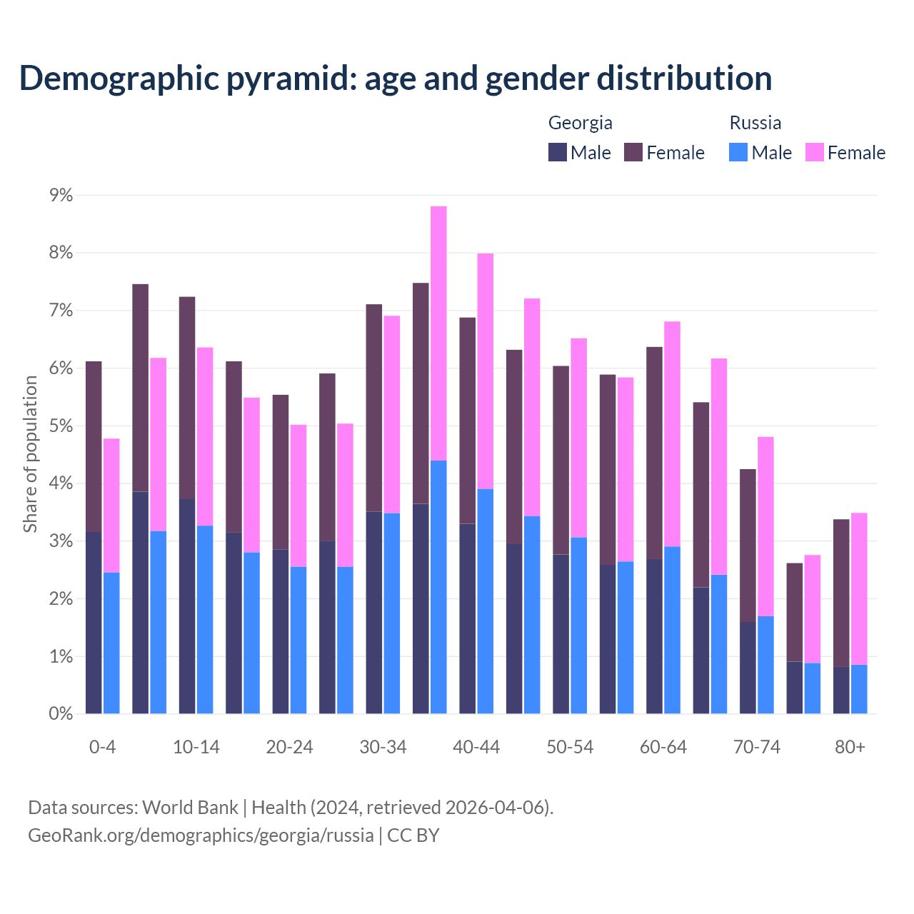 - Georgia is ranked 59/196 by median age (oldest to youngest) vs 42/196 for Russia.