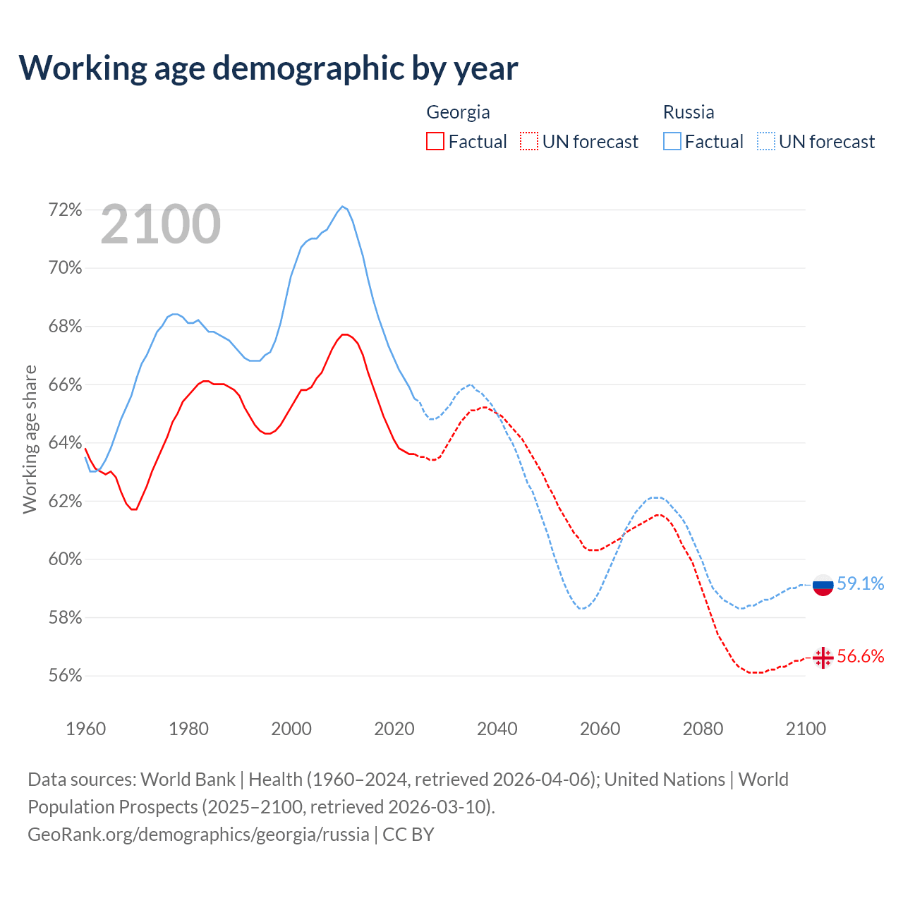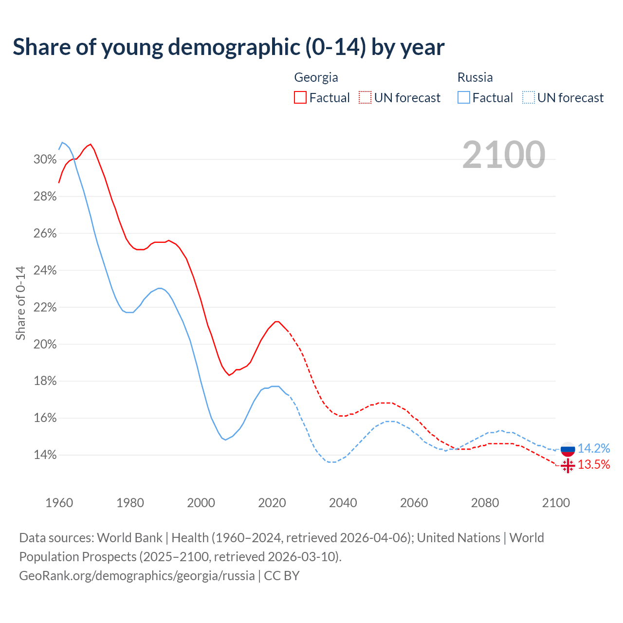 Median age Georgia vs Russia, 1960-2100