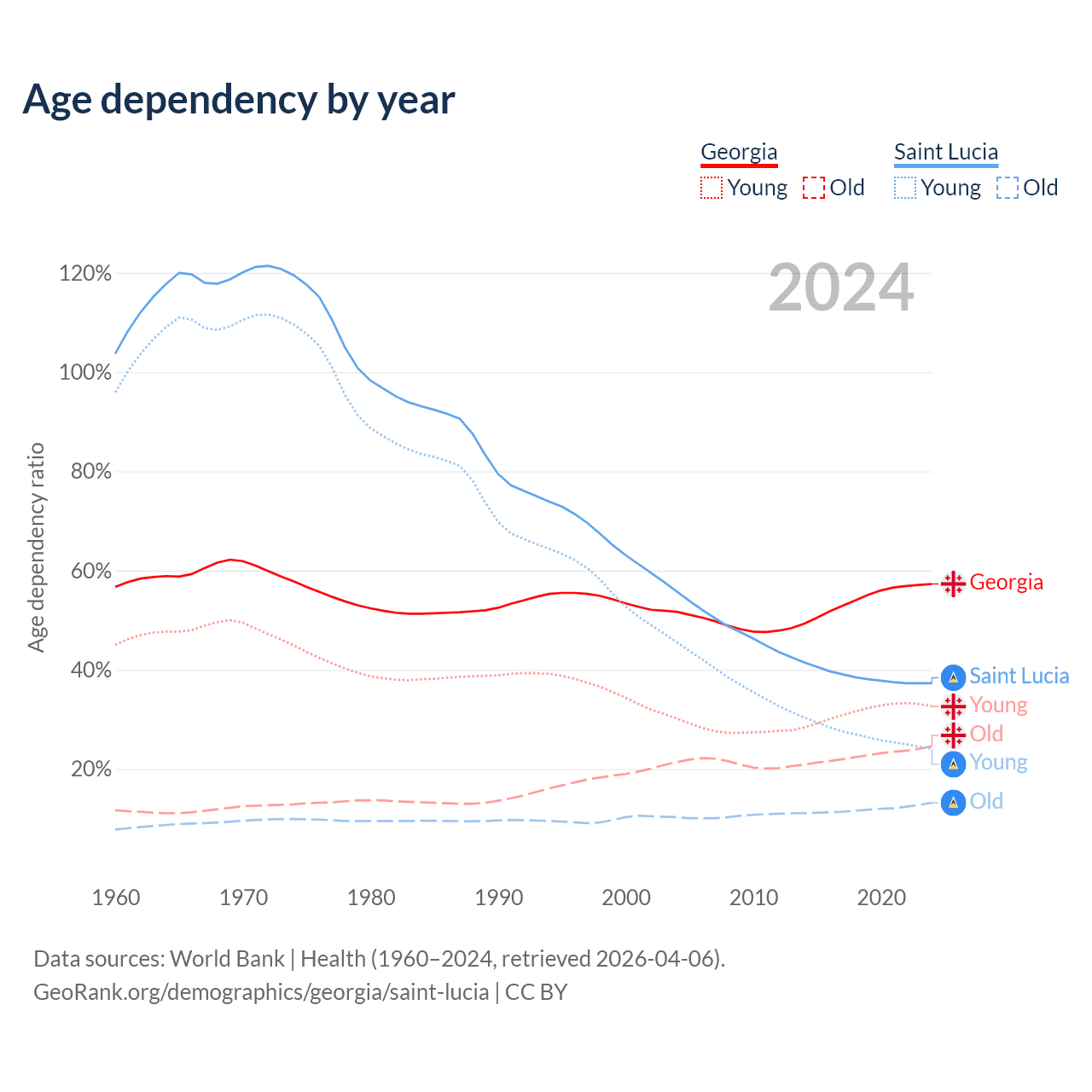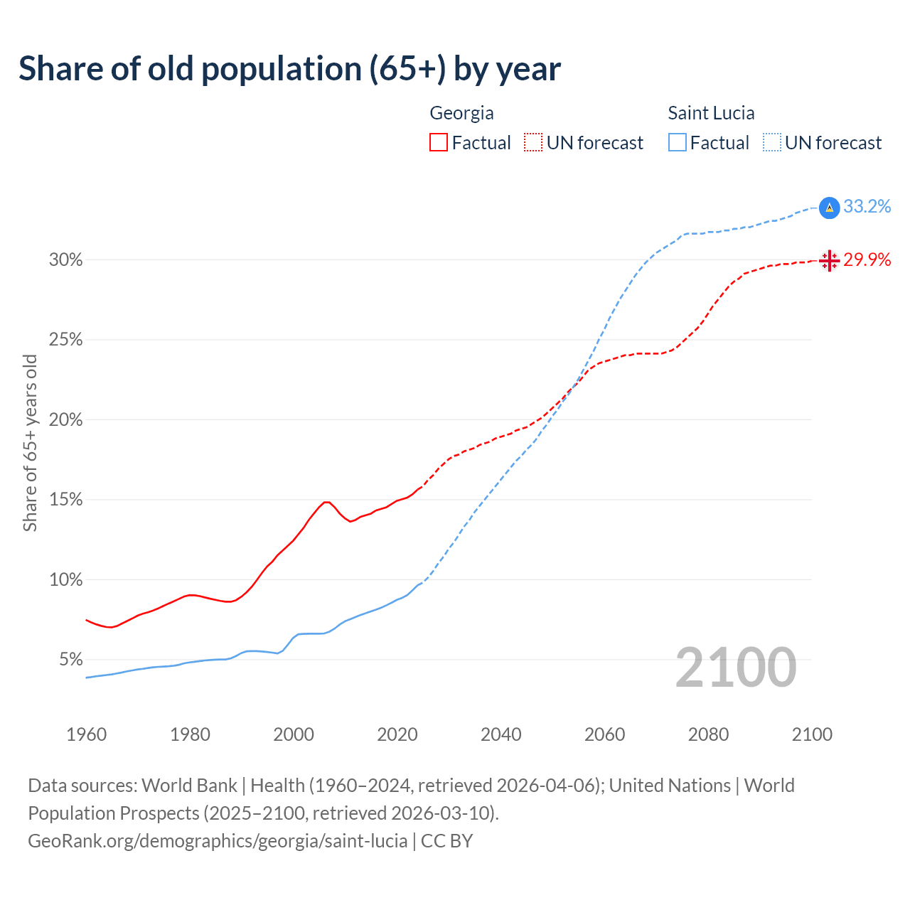 - The share of old-age demographic (65+) in Georgia is 15.6% vs 9.62% in Saint Lucia.