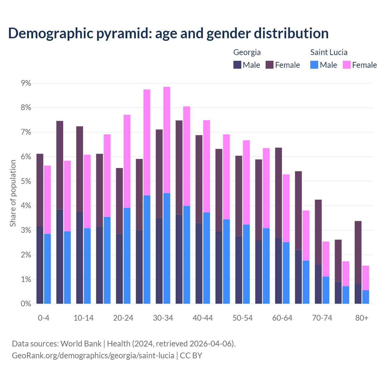 - Georgia is ranked 59/196 by median age (oldest to youngest) vs 74/196 for Saint Lucia.