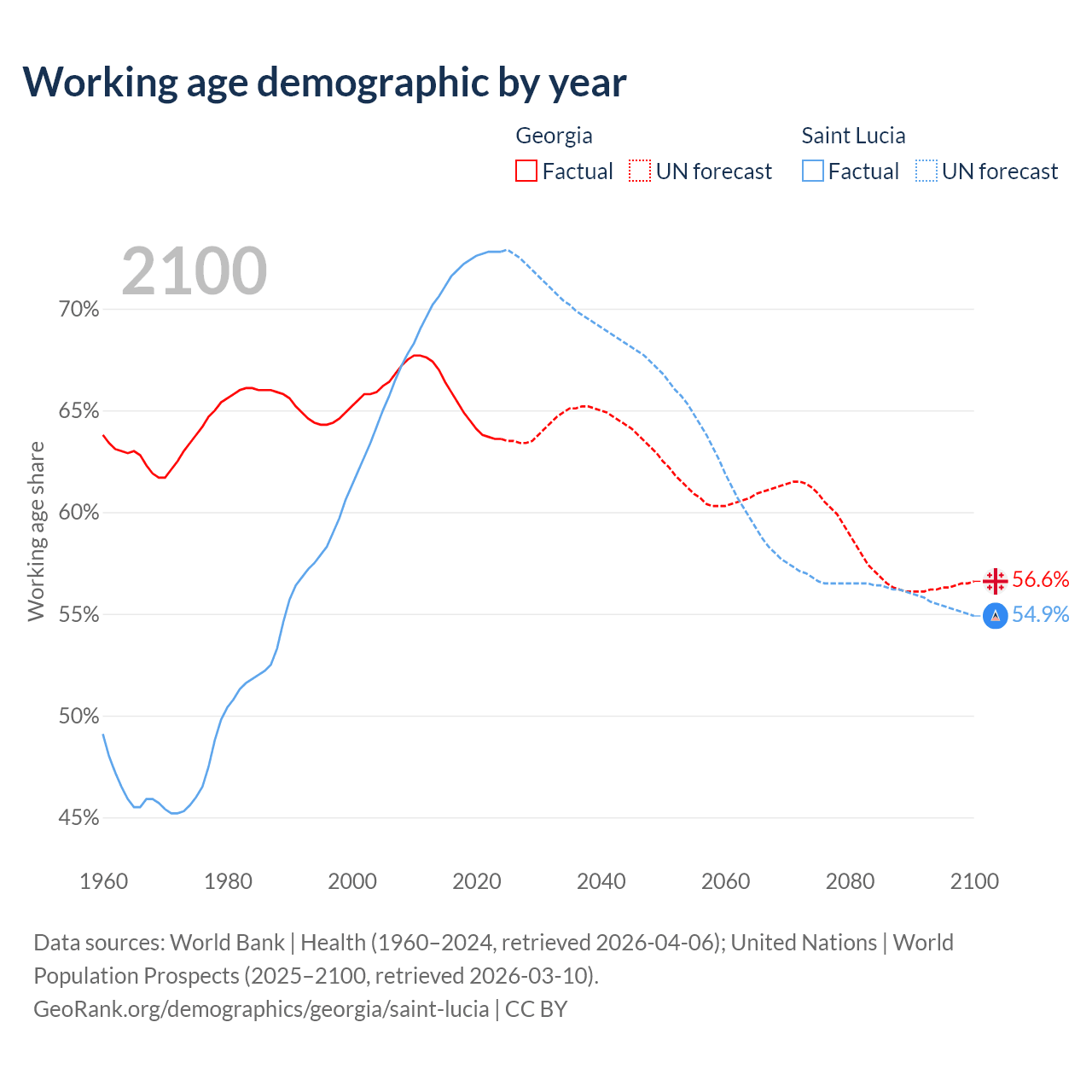 - Georgia has 2.35M working age adults (aged 15-64) vs 132K in Saint Lucia.