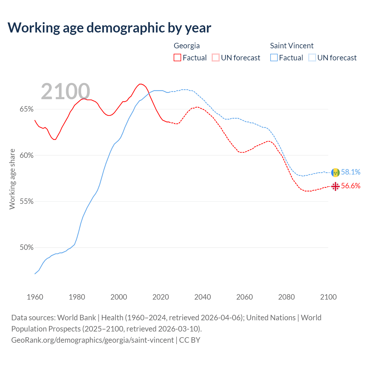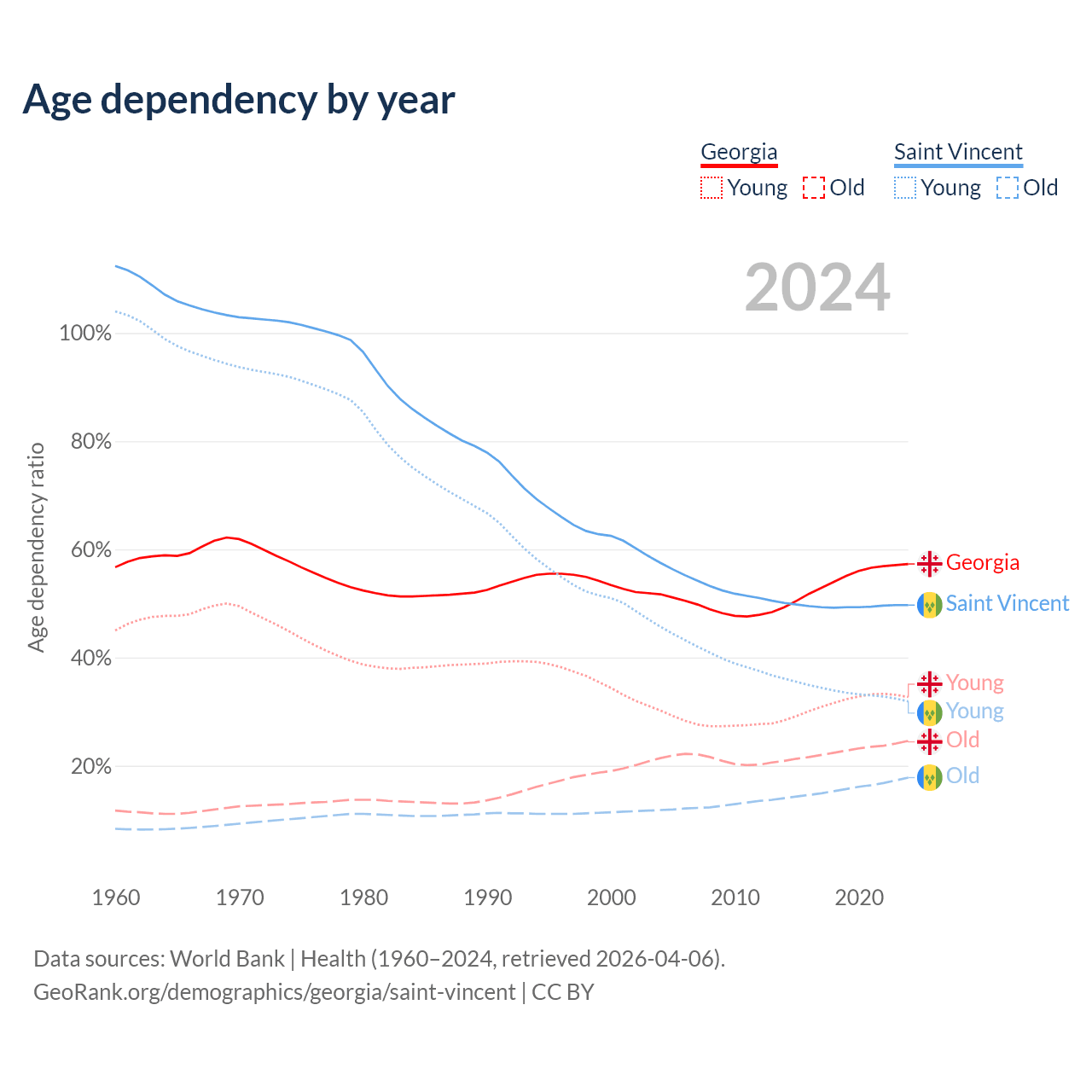 - The share of old-age demographic (65+) in Georgia is 15.6% vs 11.9% in Saint Vincent.