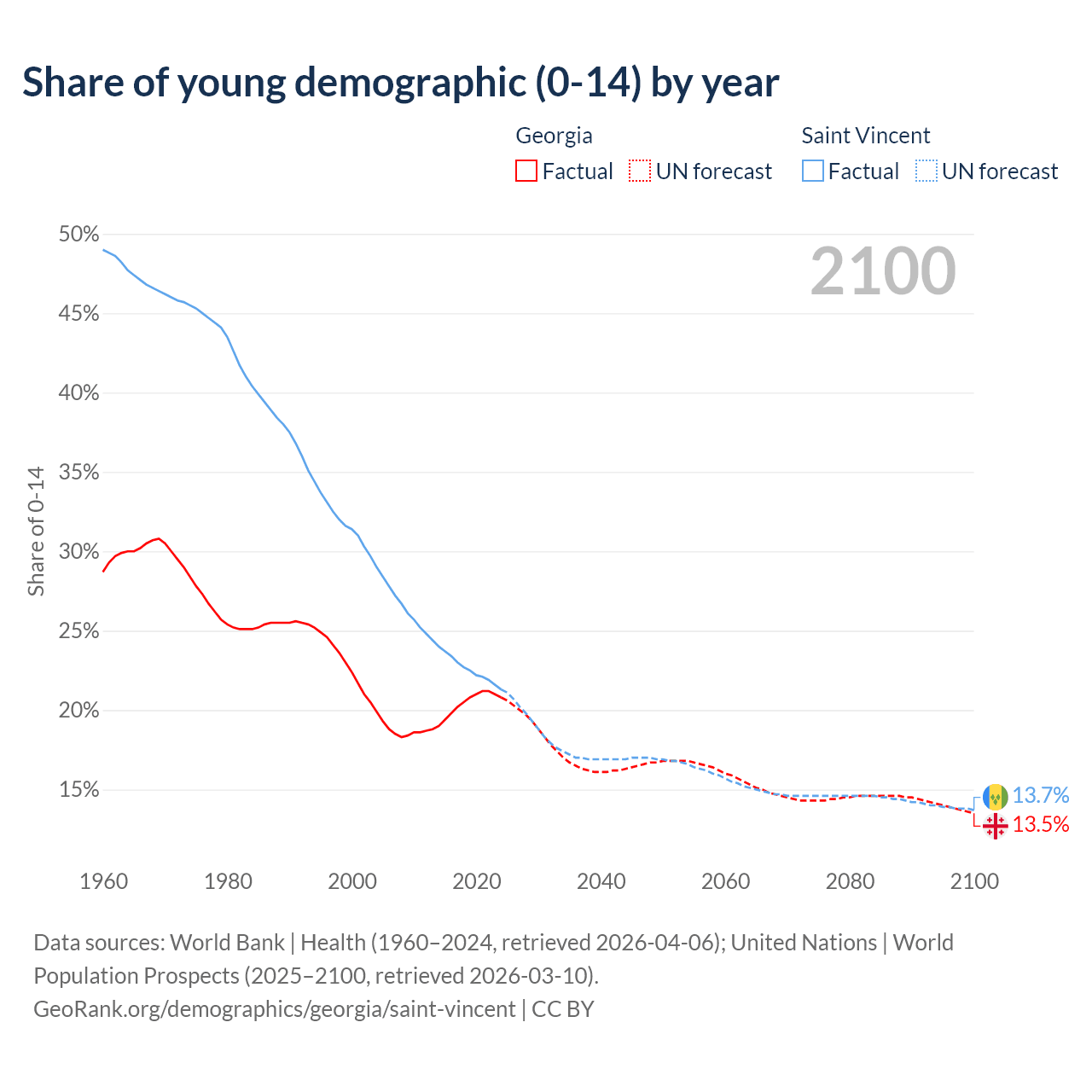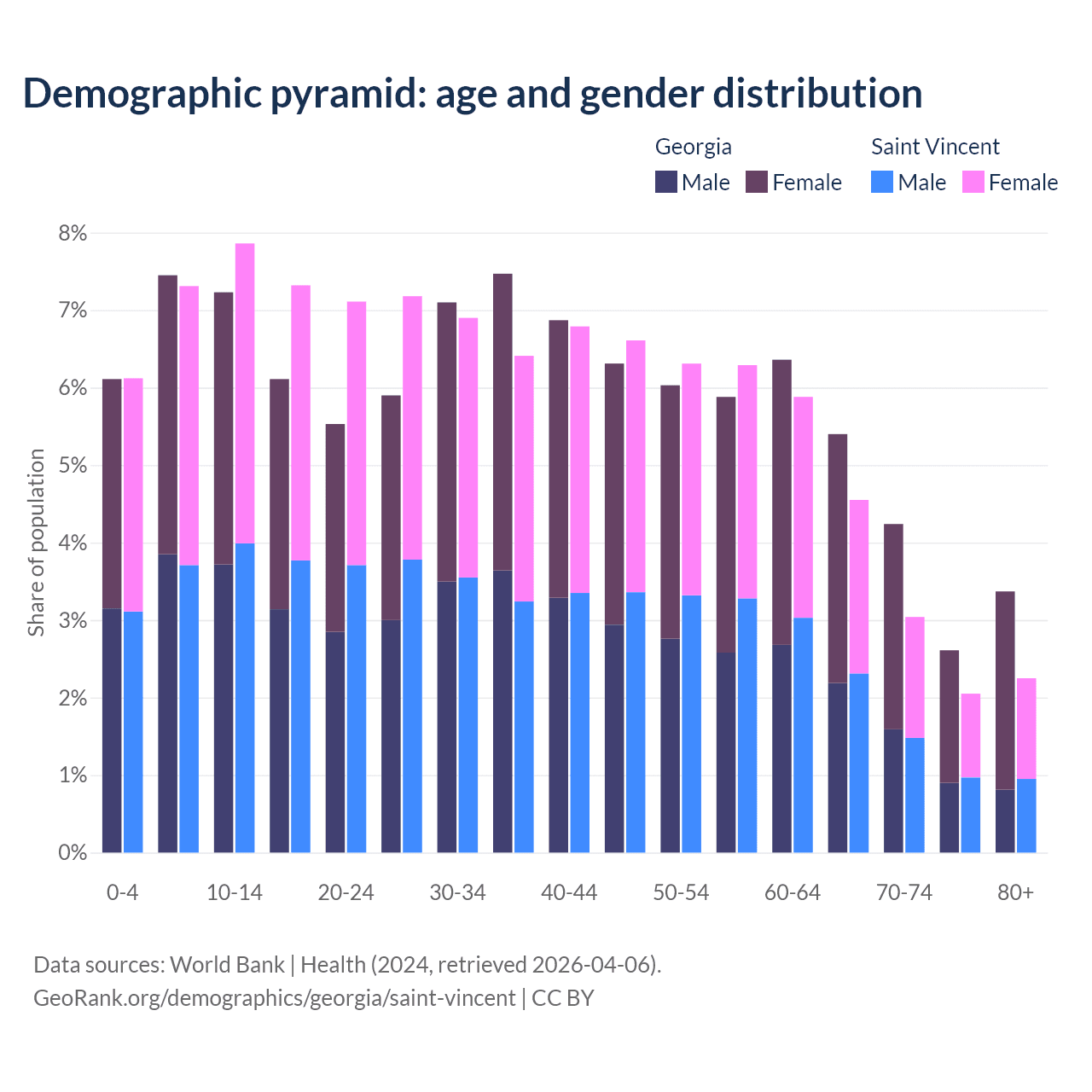 - The share of young demographic (0-15 years old) in Georgia is 20.8% vs 21.3% in Saint Vincent.