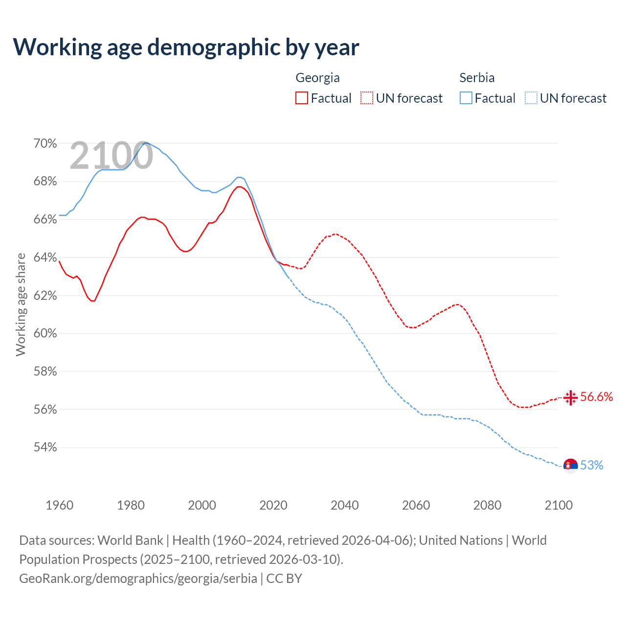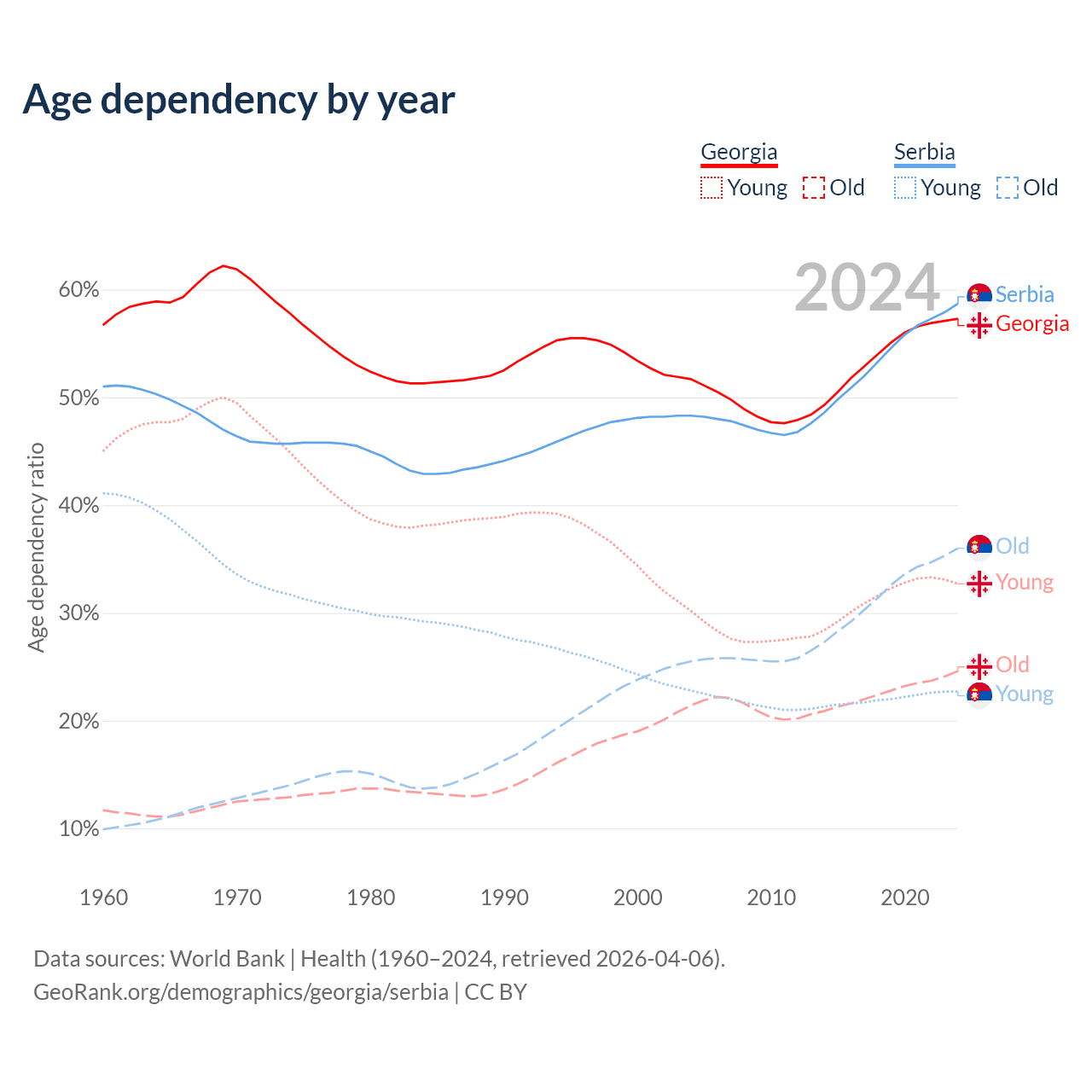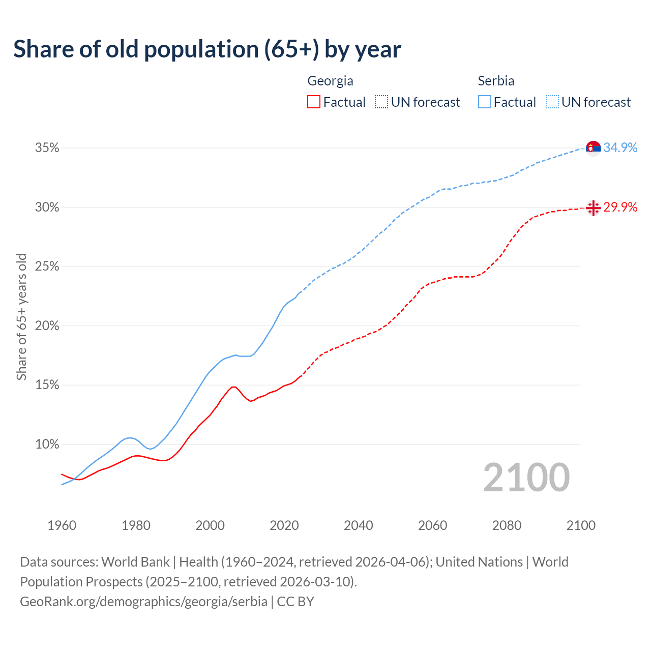 The share of older people aged 65 and over is 15.6% in Georgia and 22.7% in Serbia. Life expectancy in Georgia compared to Serbia .