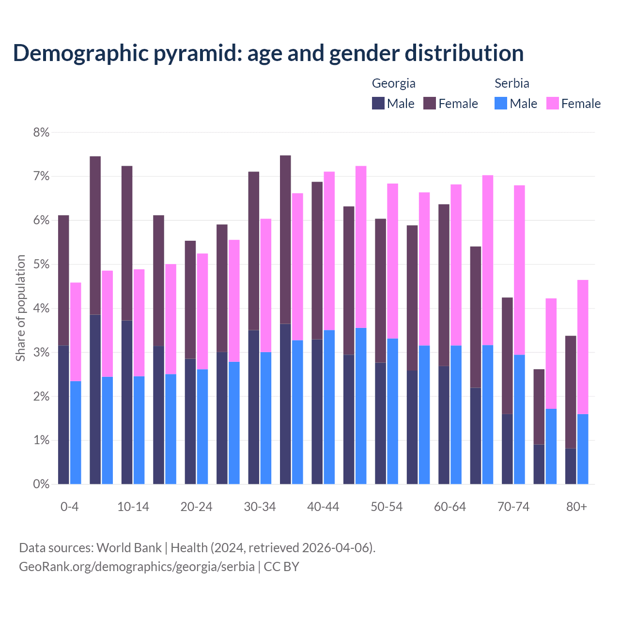 - Georgia is ranked 59/196 by median age (oldest to youngest) vs 15/196 for Serbia.