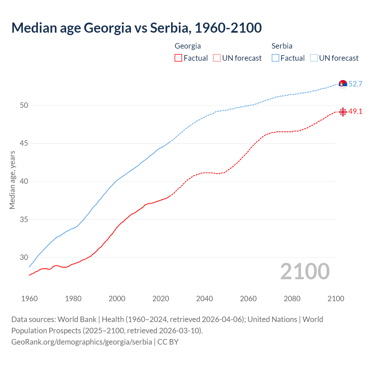 - The median age in Georgia is 38 years compared to 45.1 years in Serbia.