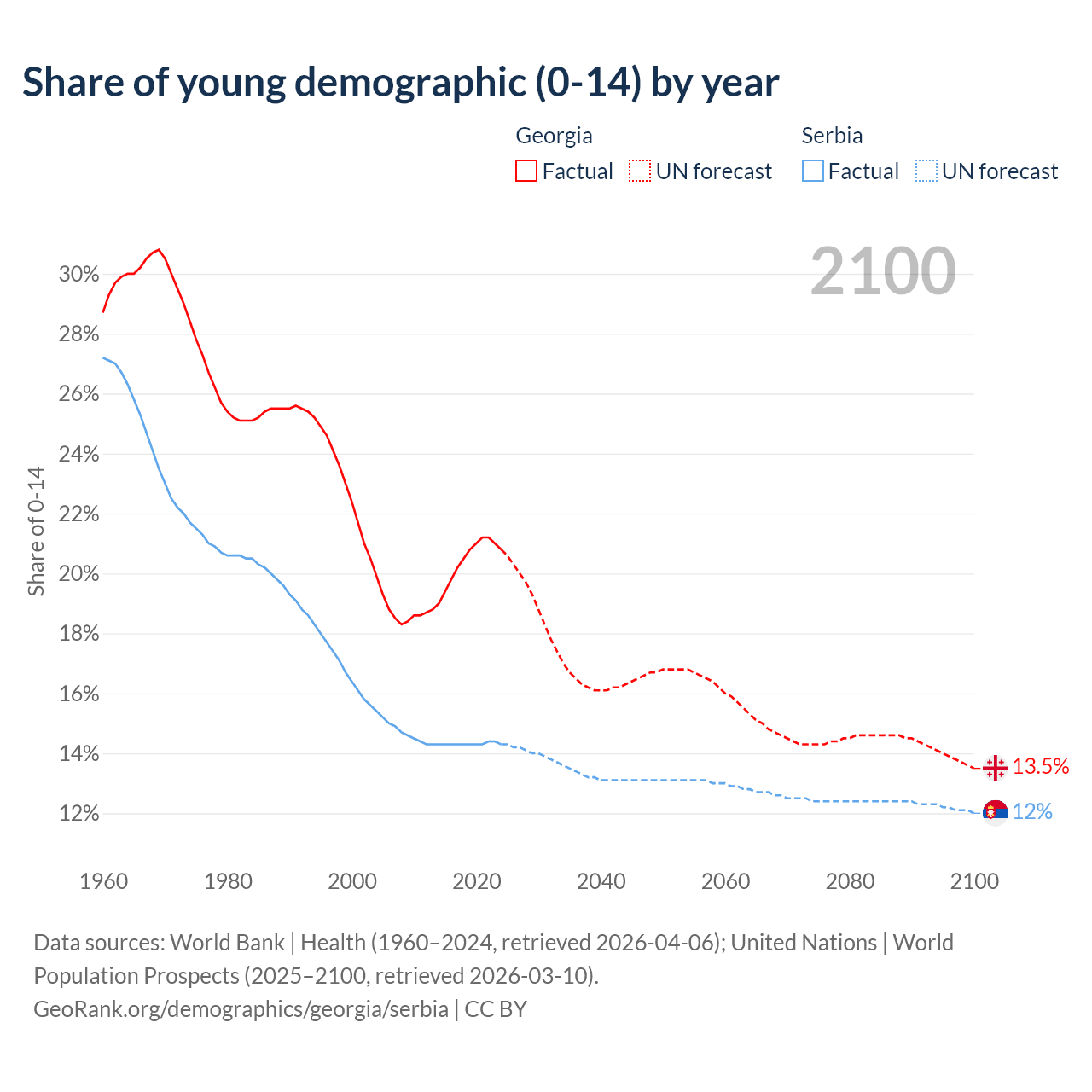 - The share of young demographic (0-15 years old) in Georgia is 20.8% vs 14.3% in Serbia.